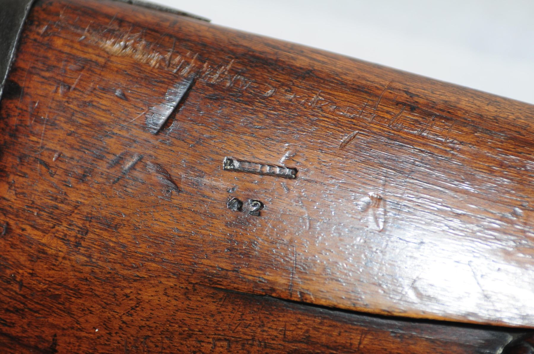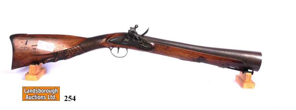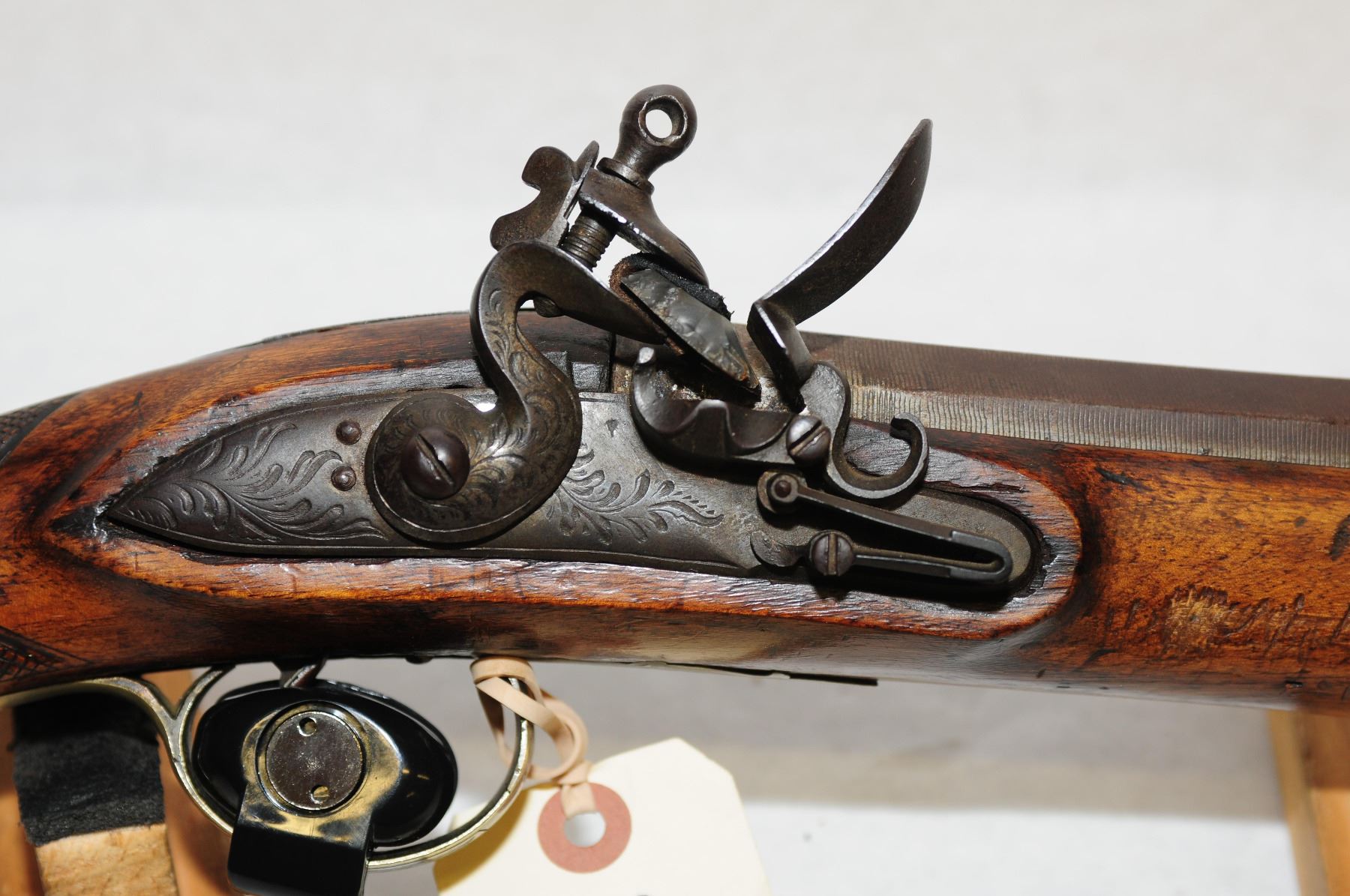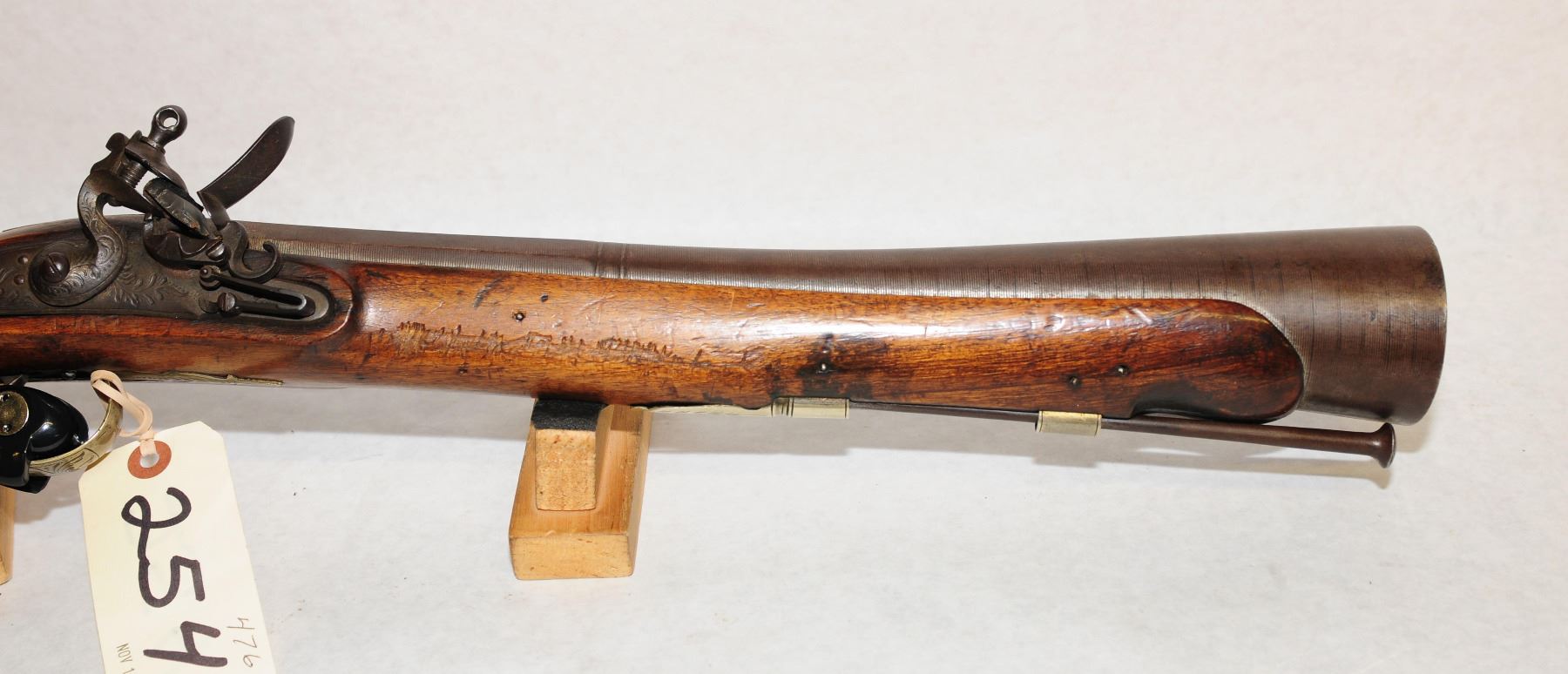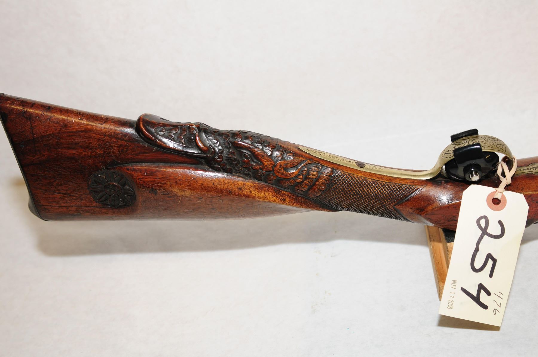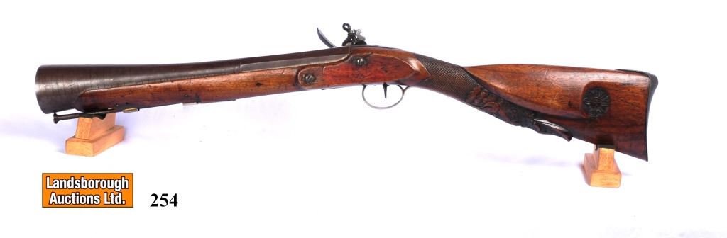 Antique, single shot, Fintlock, 15" Damascus barrel, SN none. Wood has detailed engraving with numerous, dents, gouges and scratches, bluing is brown, bore pitted. Detailed engraving on metal.