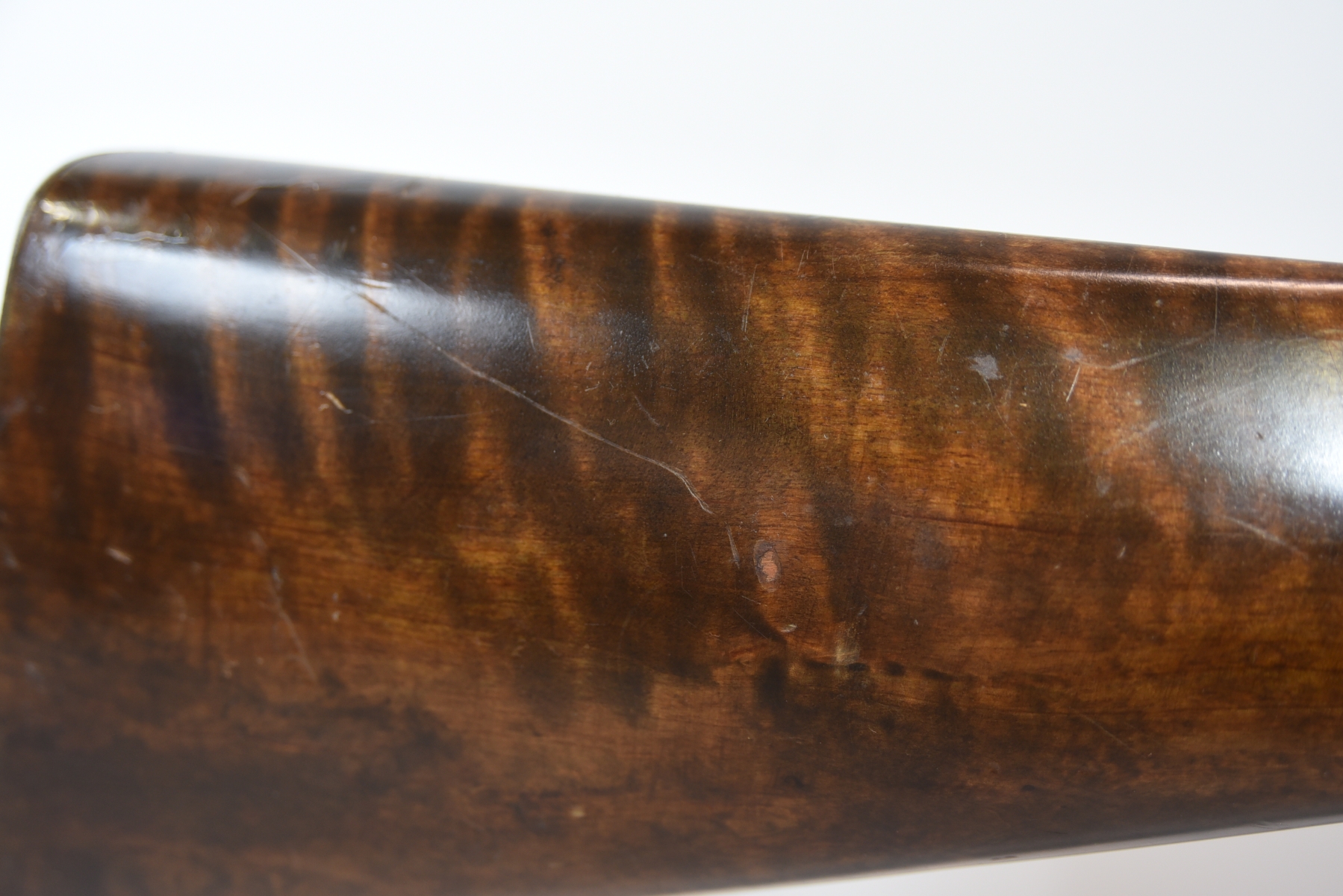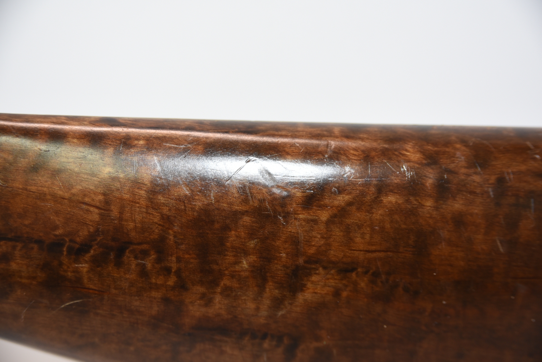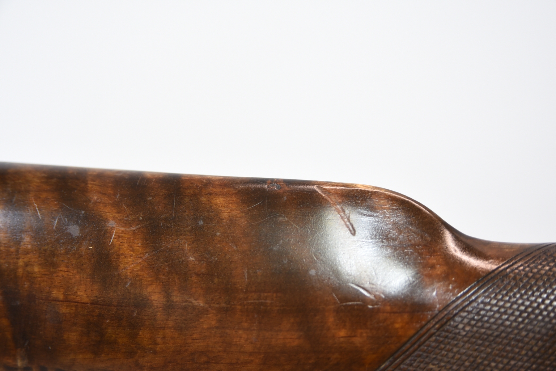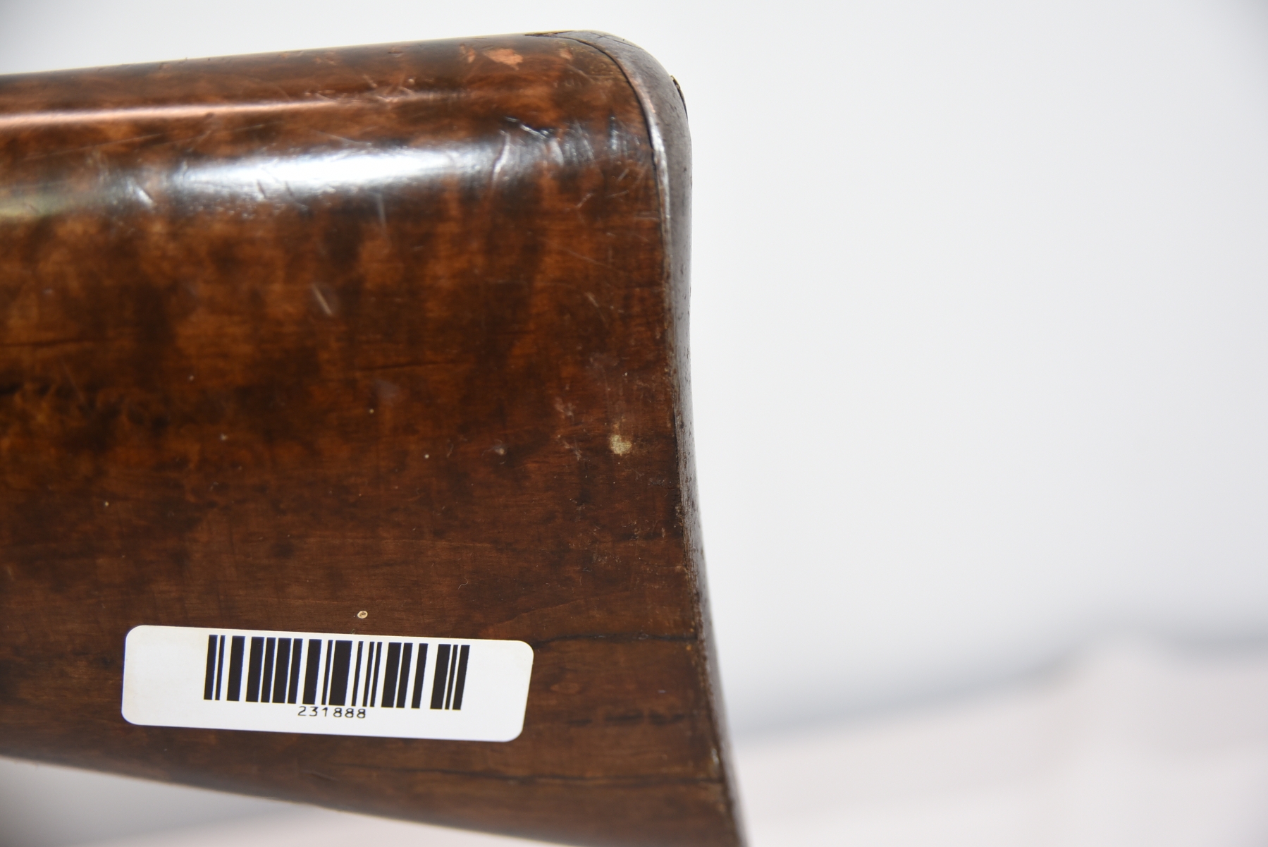 Wood stock shows scratches, scuffs, few light dents, a chip on the left side by grip area, rear sling mount is missing, there are cracks near the butt plate area; condition is fair.