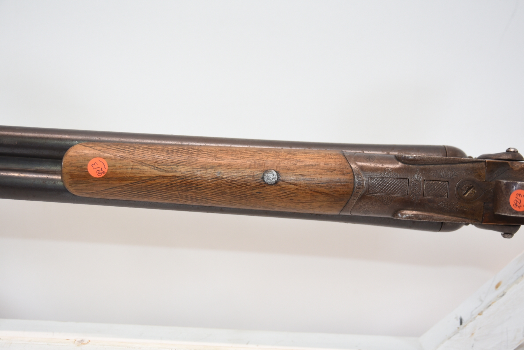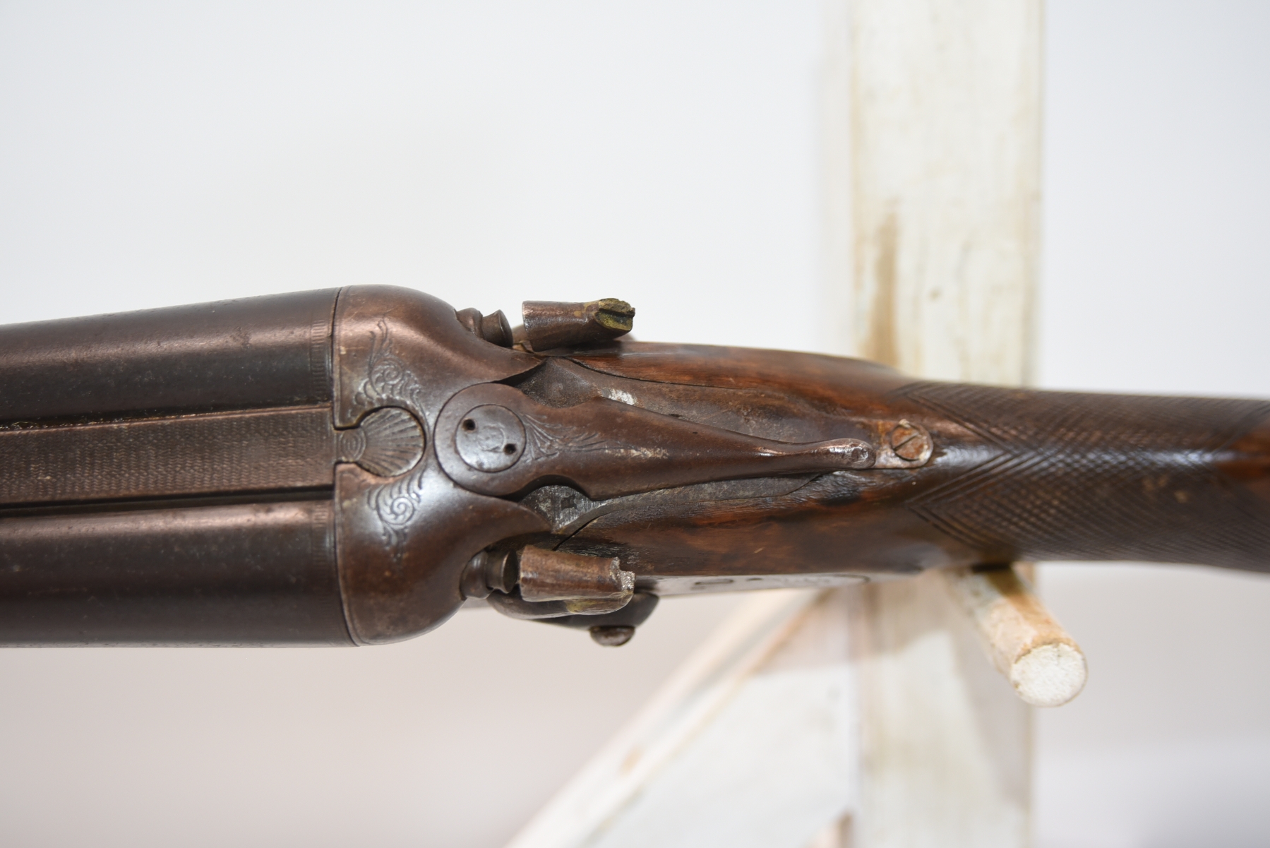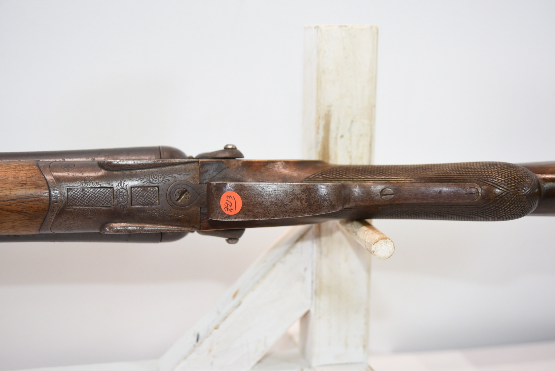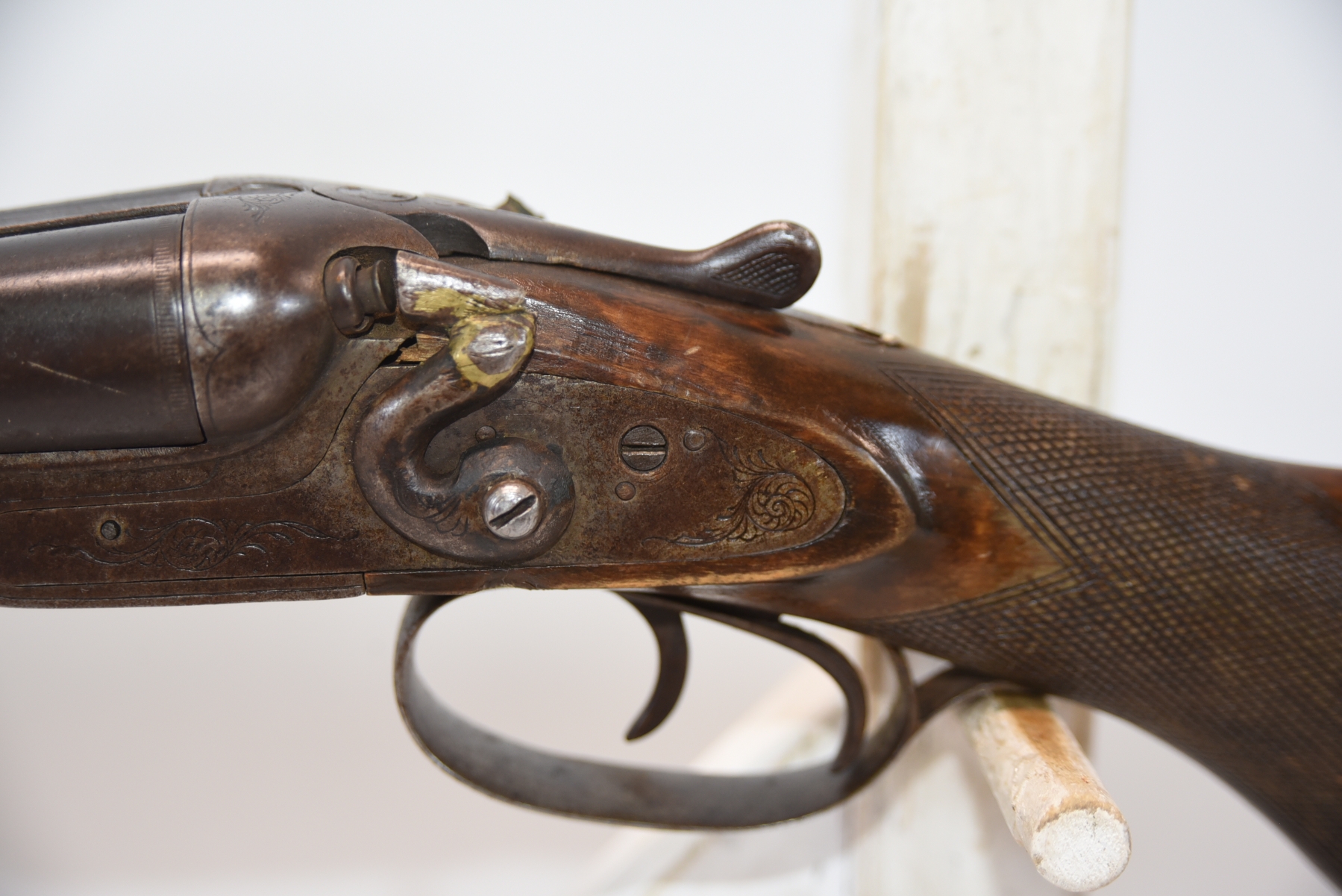 Metal shows broken hammer spurs, patina, rust, scratches and scuffs, two tiny light dings on left barrel; condition is less than fair.