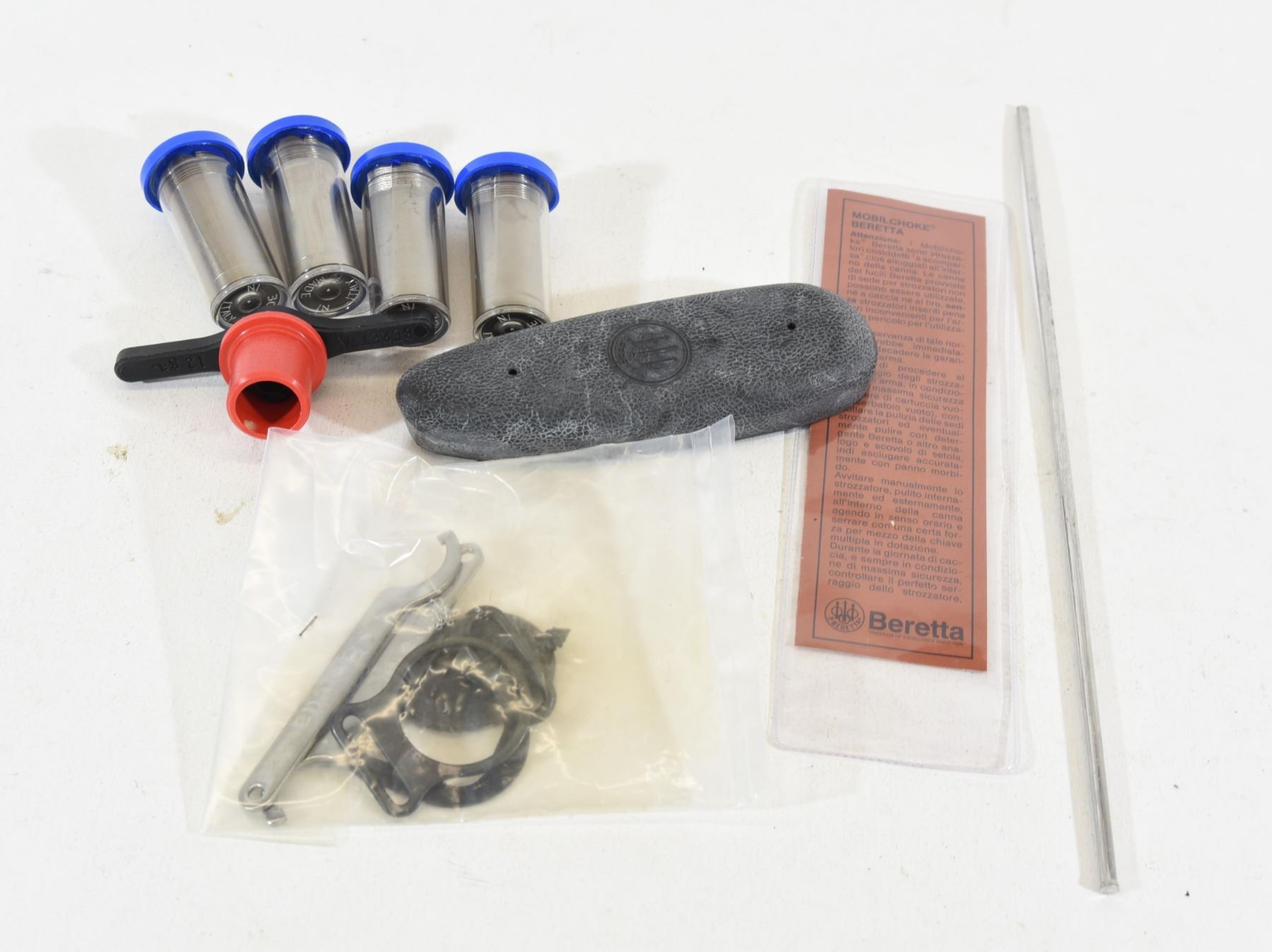 1) 4 Choke tubes Full, Modified, Improved Cylinder, Skeet. 2) Choke tube tool. 3) Butt pad. 4) single shot adapter rod. 5)bag of accessories.