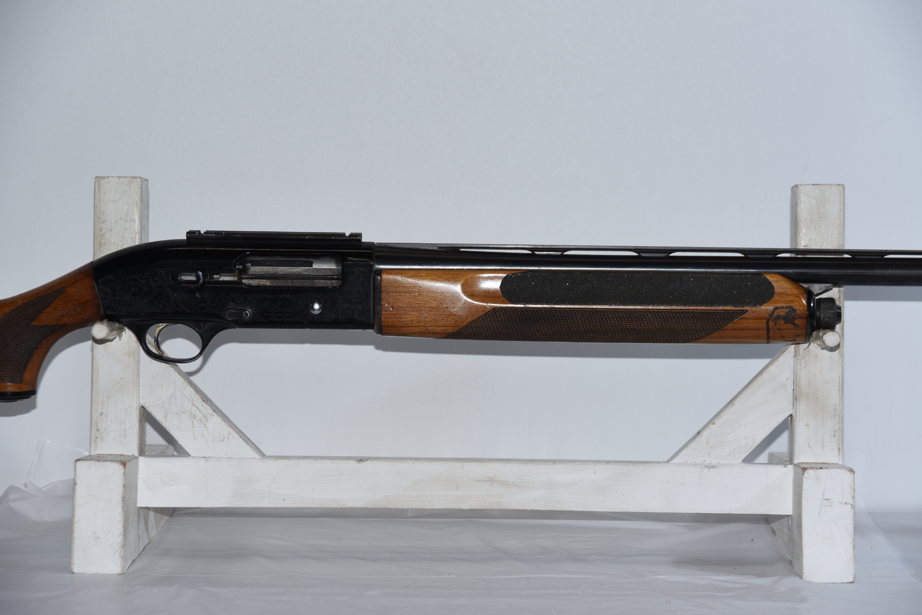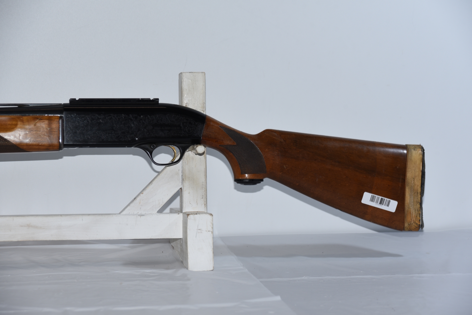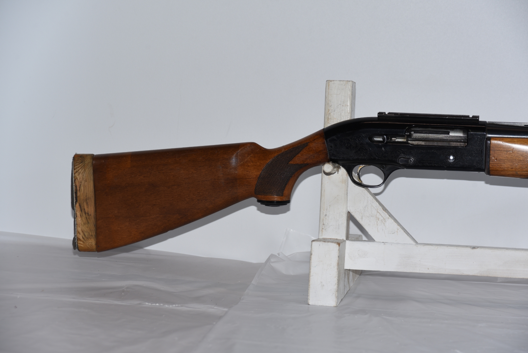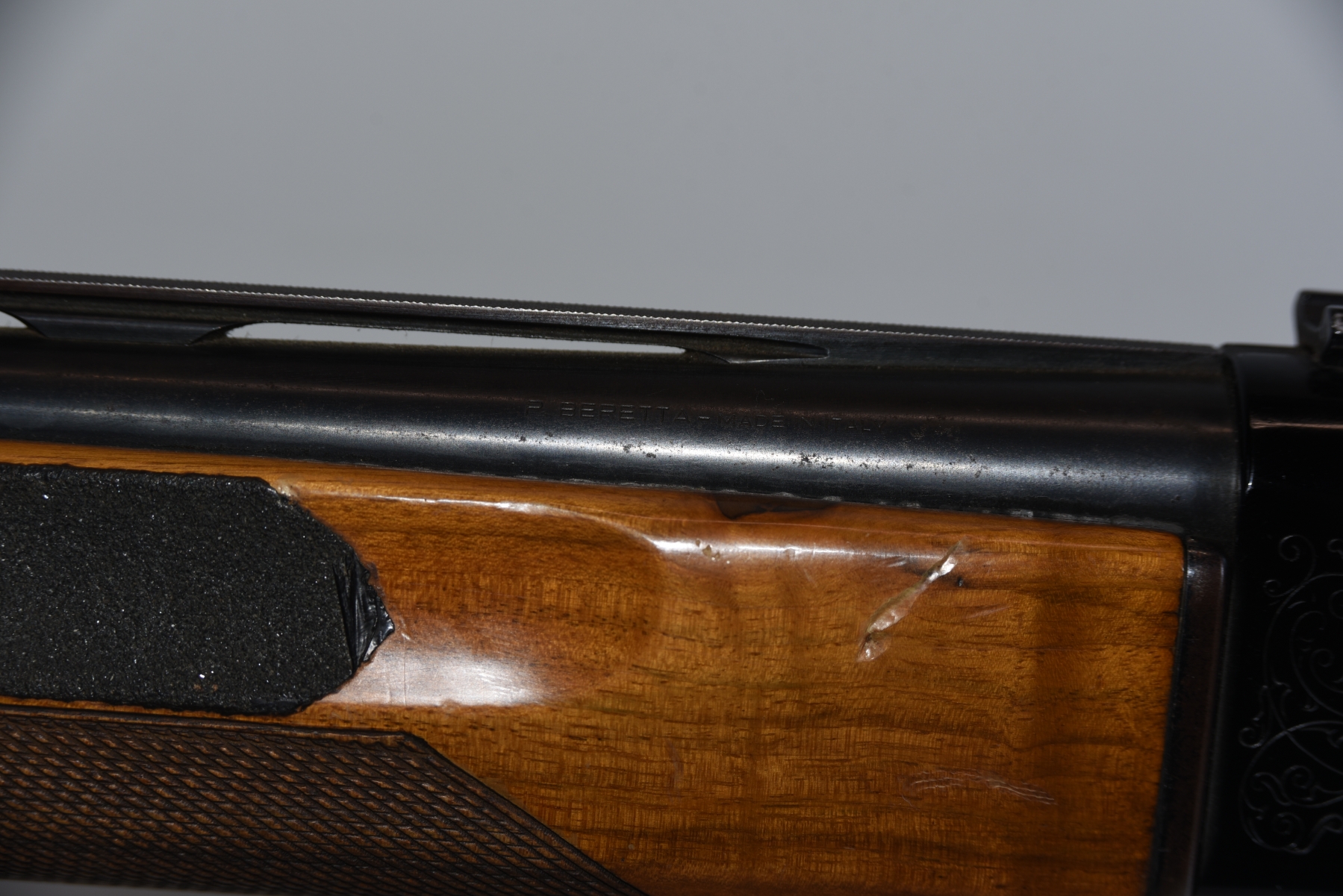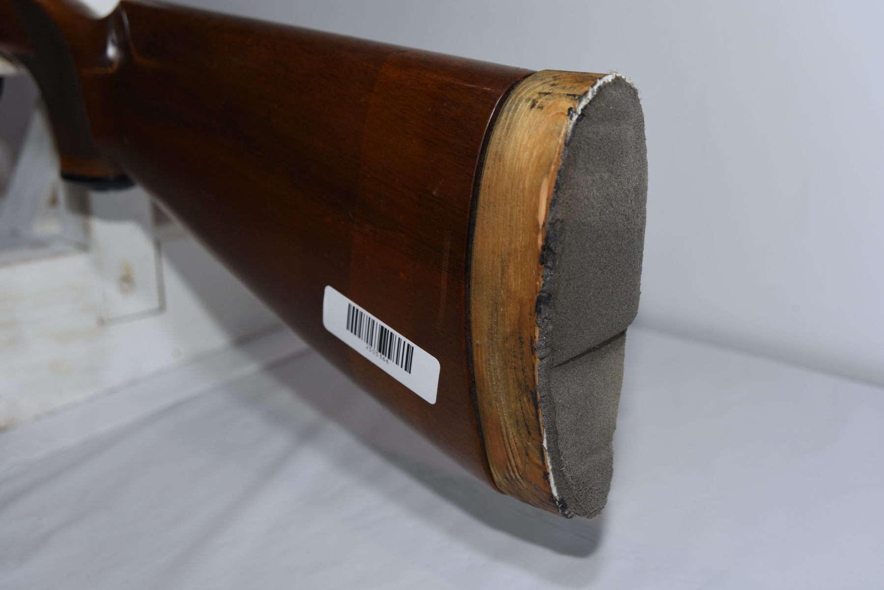 Wood stock has a piece added to increase length of pull, there is grip tape strips on the forearm, adhesive residue can also be seen, there are also scratches, scuffs, light dents; condition is fair.
