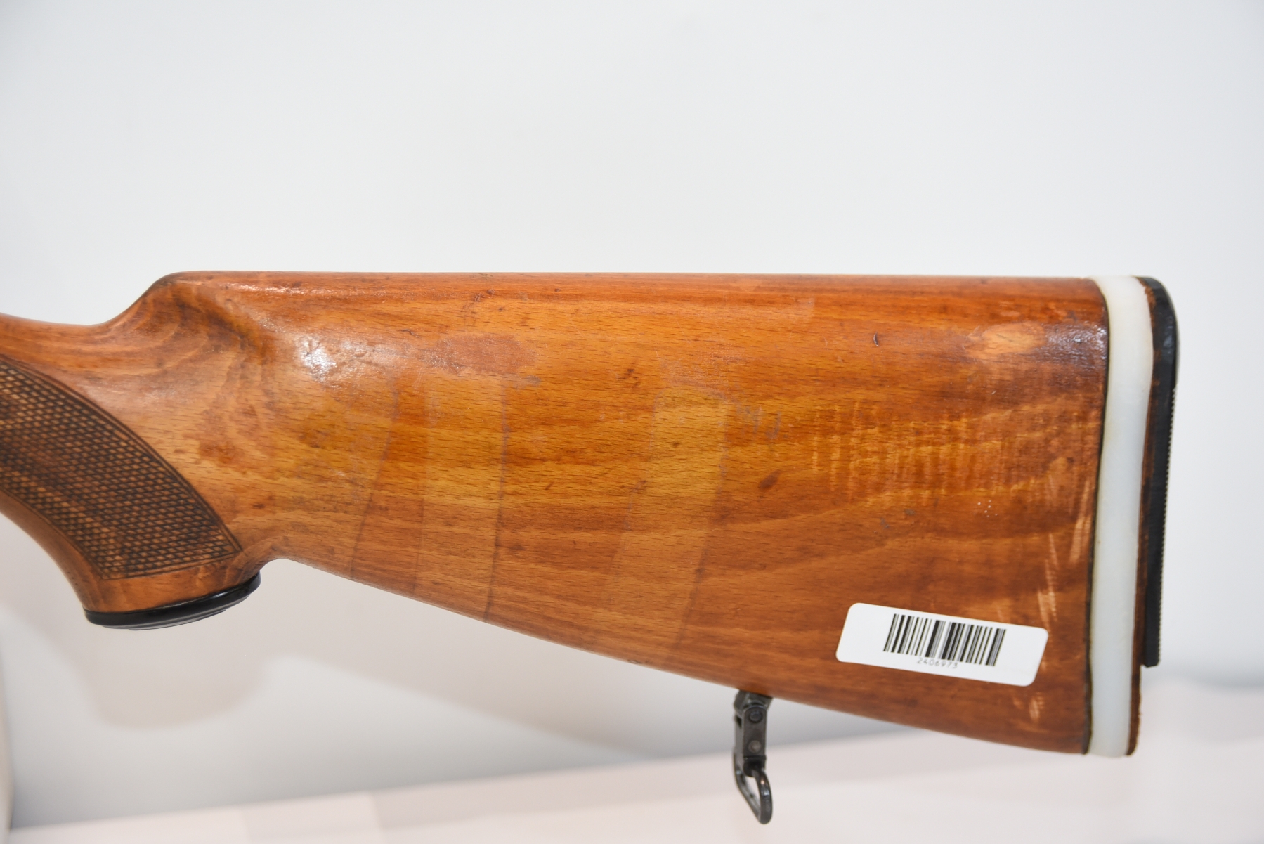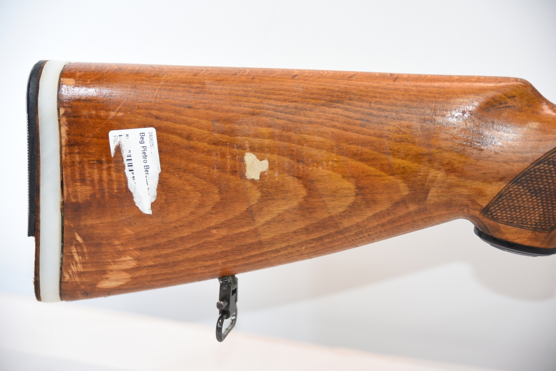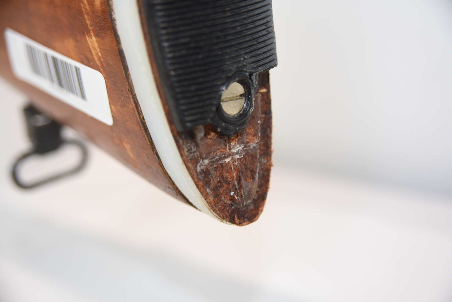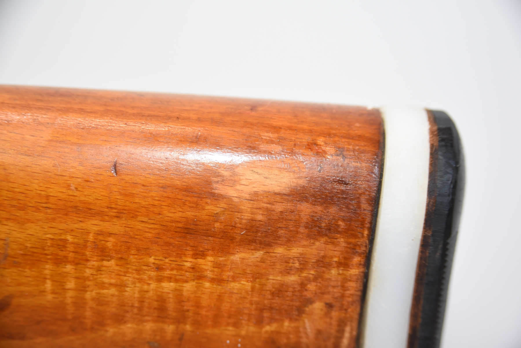 Wood stock shows a broken butt plate, a plastic butt plate spacer, there are scratches, scuffs, dents, dried tape adhesive, finish wear; condition is fair.