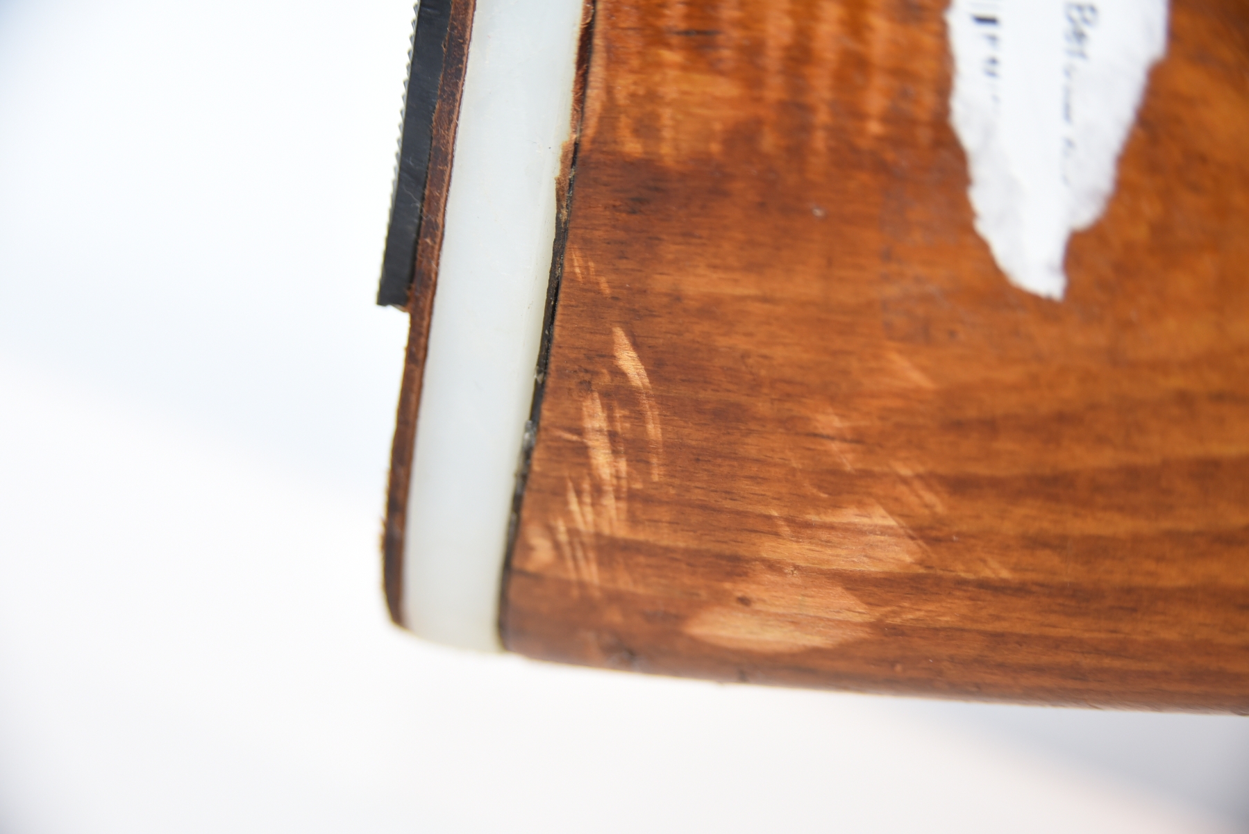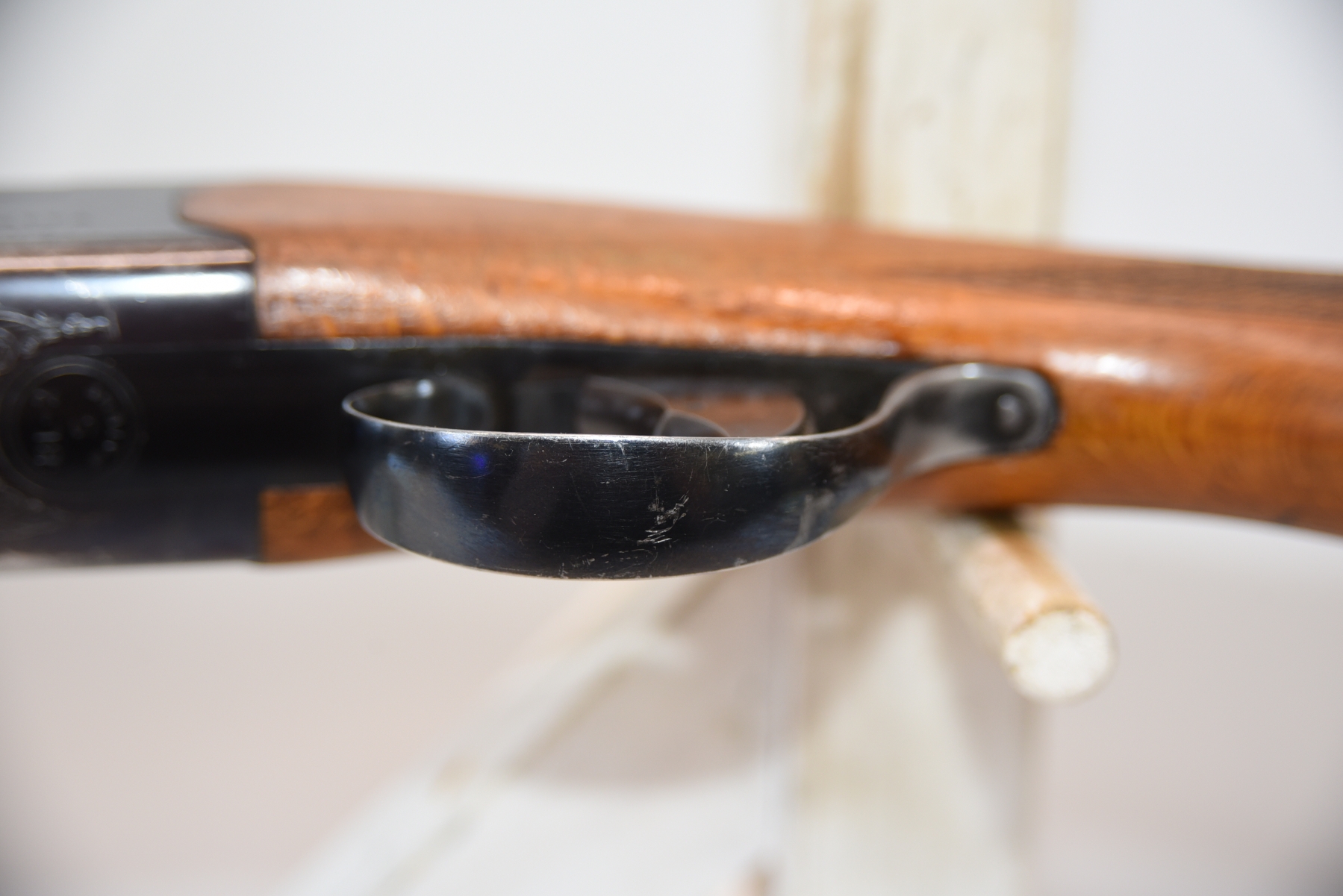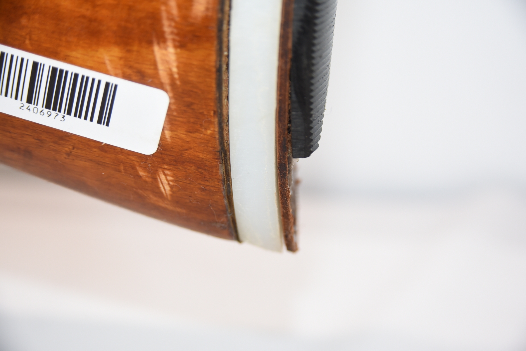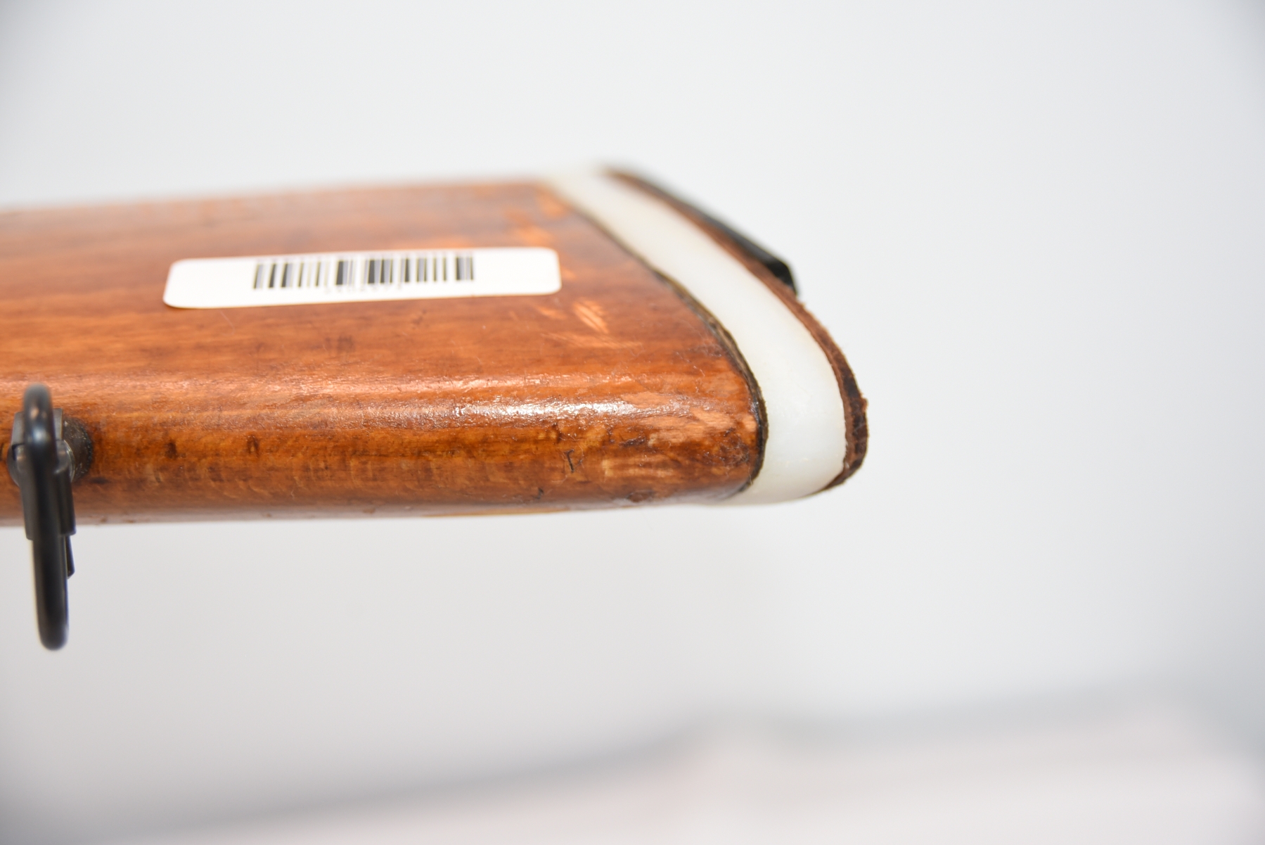 Wood stock shows a broken butt plate, a plastic butt plate spacer, there are scratches, scuffs, dents, dried tape adhesive, finish wear; condition is fair.