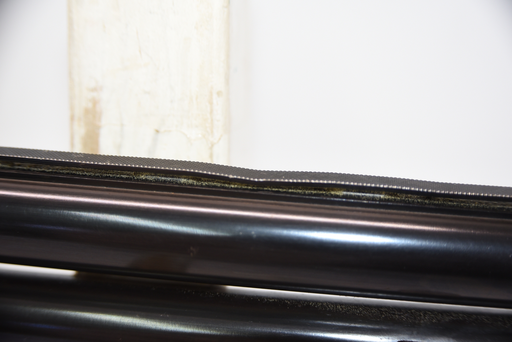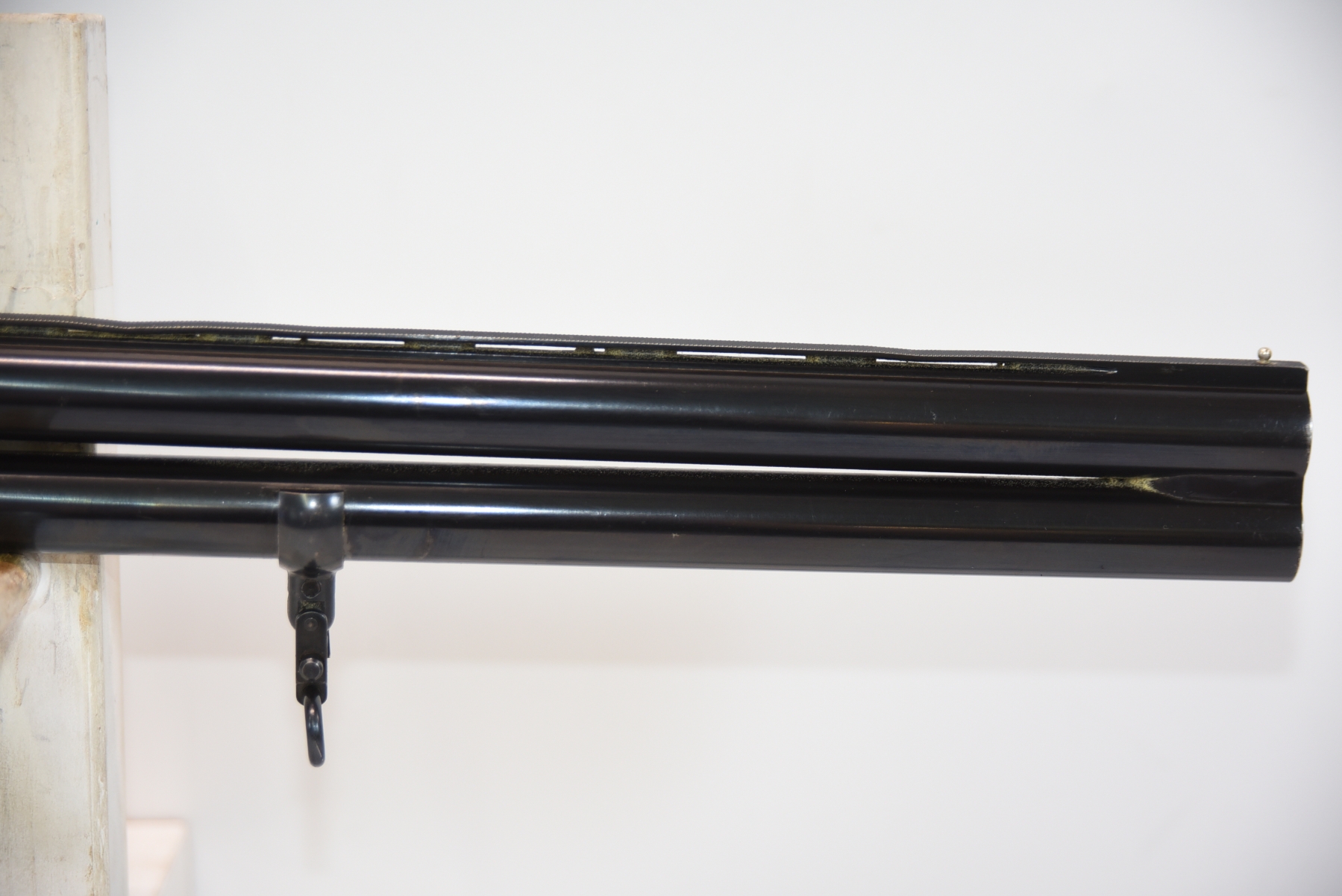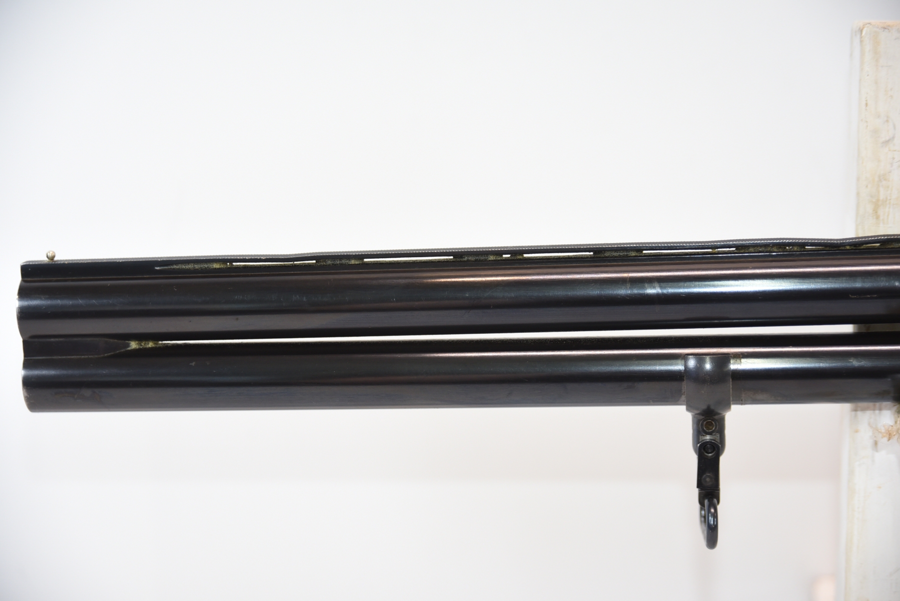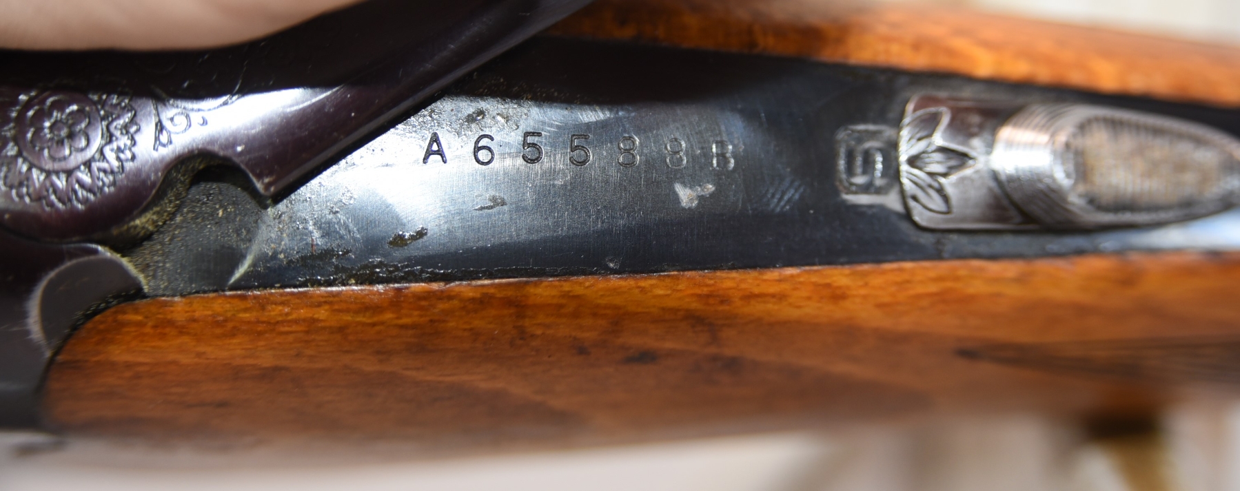 Metal shows 2 dents in the vent rib on barrel, there are finish wear scuffs and scratches, few rust specks; condition is fair.