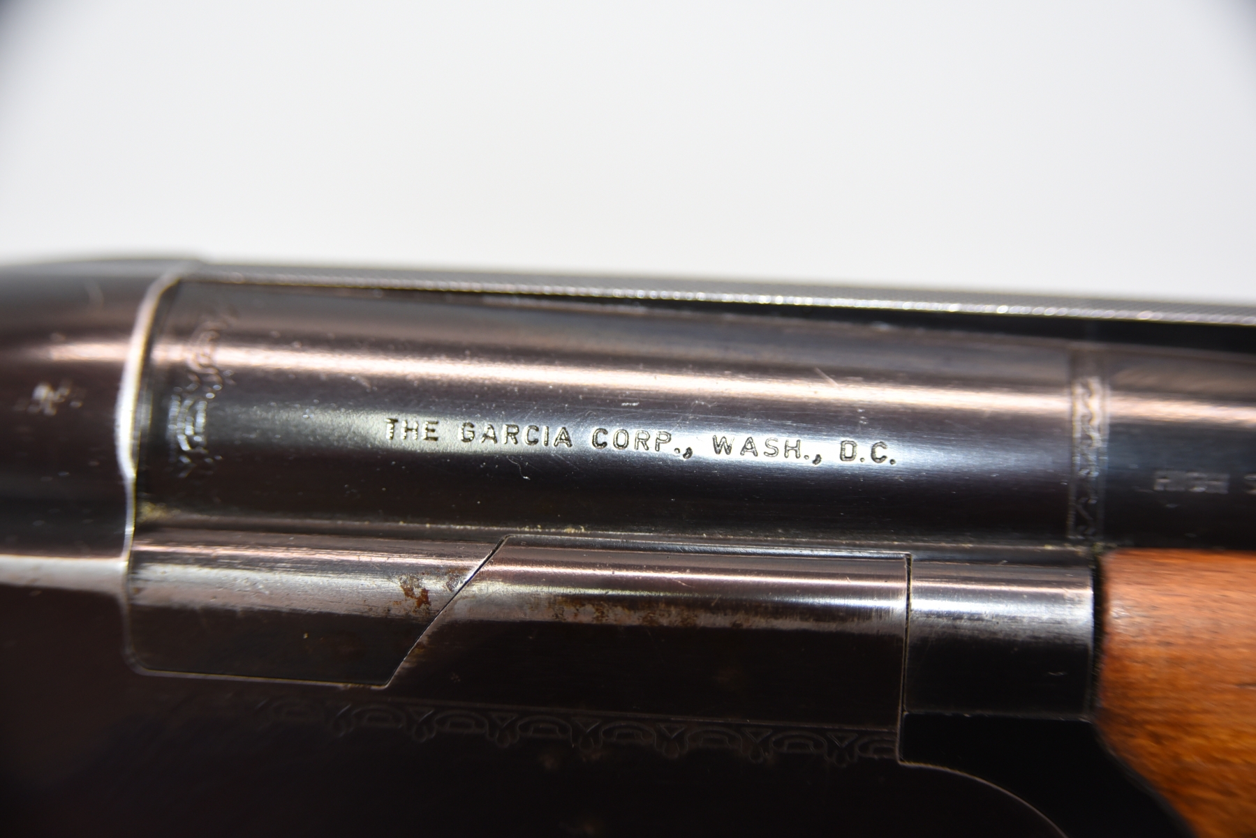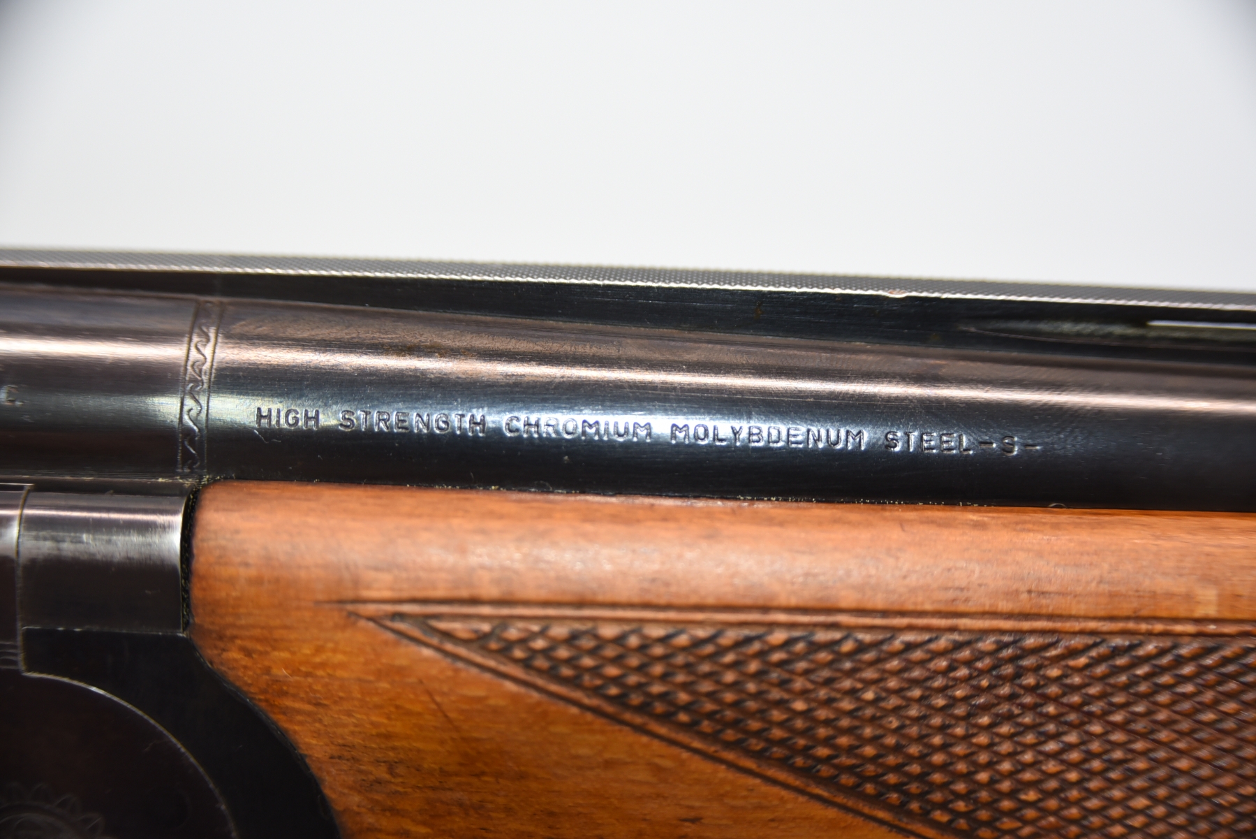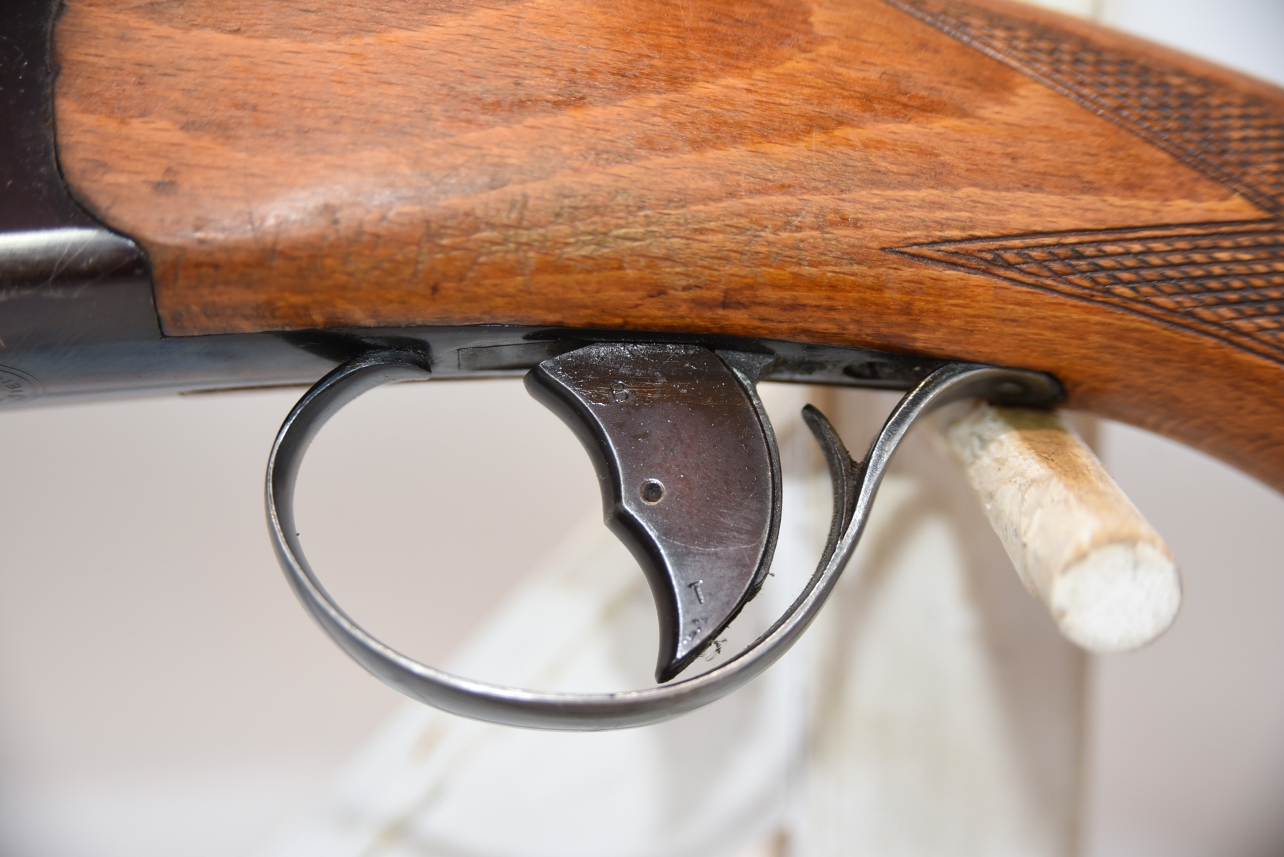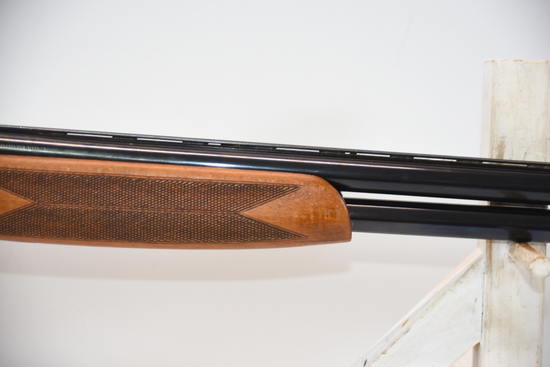 Metal shows 2 dents in the vent rib on barrel, there are finish wear scuffs and scratches, few rust specks; condition is fair.