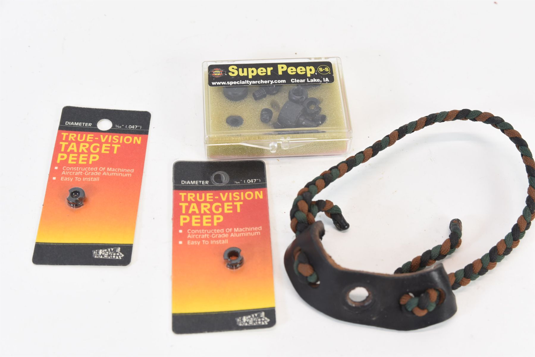 2 True-Vision target peeps 3/64" (.047") diameter, 1 package of Super Peeps, and 1 wrist strap.