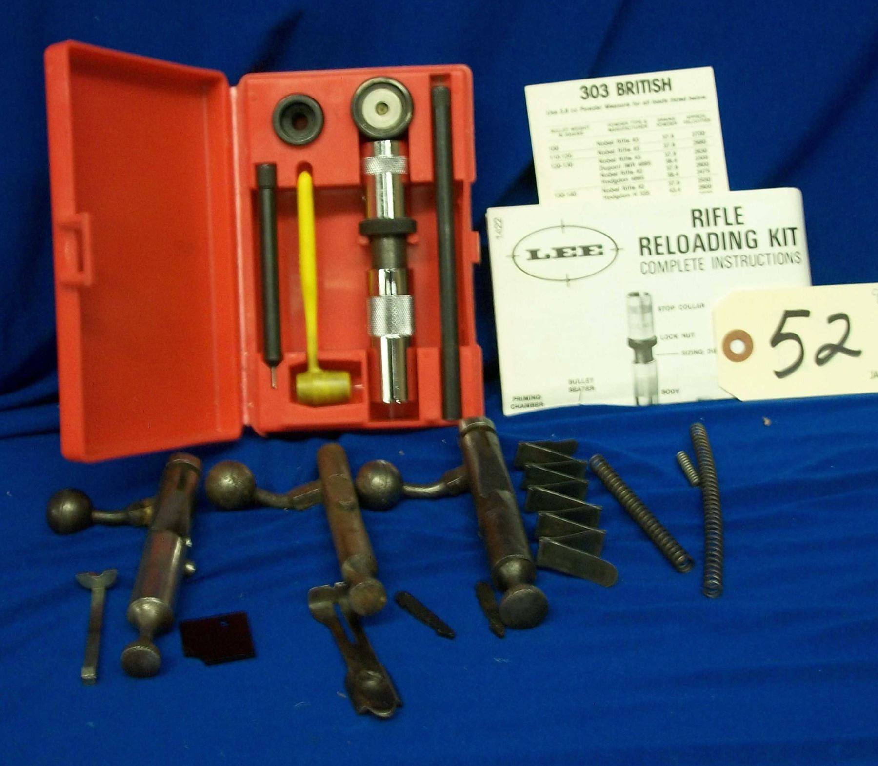 Three unknown bolts, three springs and a mag. spring, unknown rear sight, Lee rifle reloading kit for 303 British