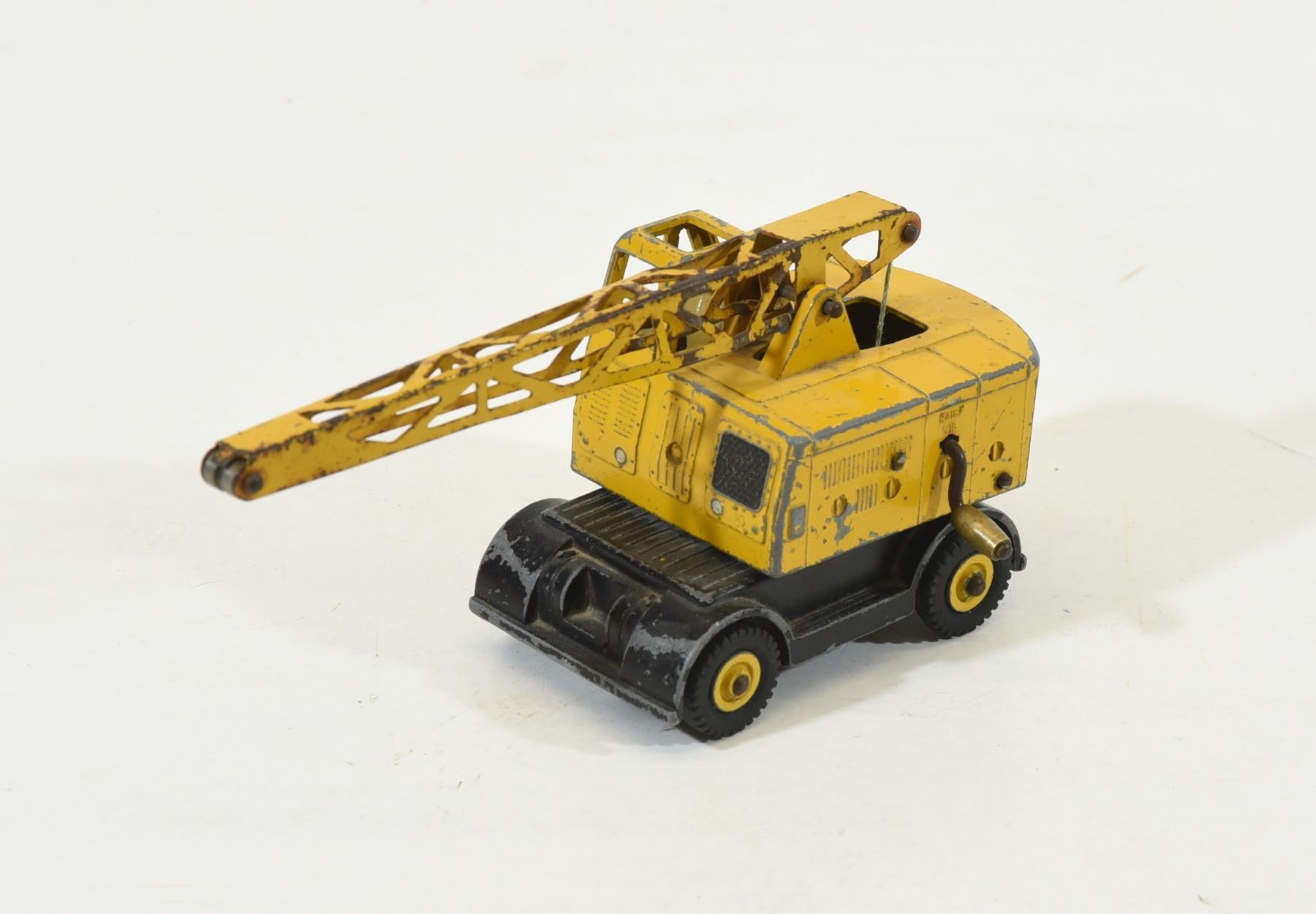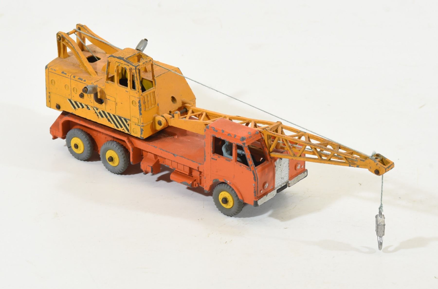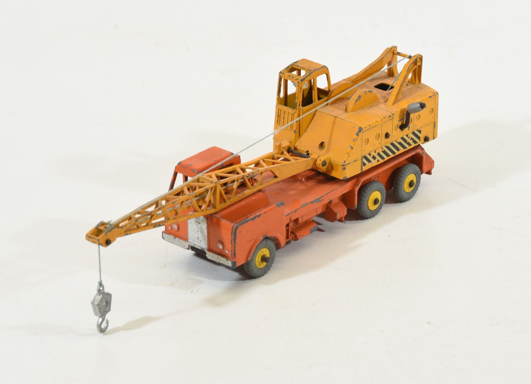 1) Dinky Supertoys mobile crane #571. The jib is damaged, but works. The handle for the hook is broken off and the hook is missing. 2) Dinky Supertoys 20 ton lorry mounted crane. The jib and hook both raise and lower. Made by Meccano. 3) Matchbox Super Kings K-12 mobile crane. Made by Lesney.