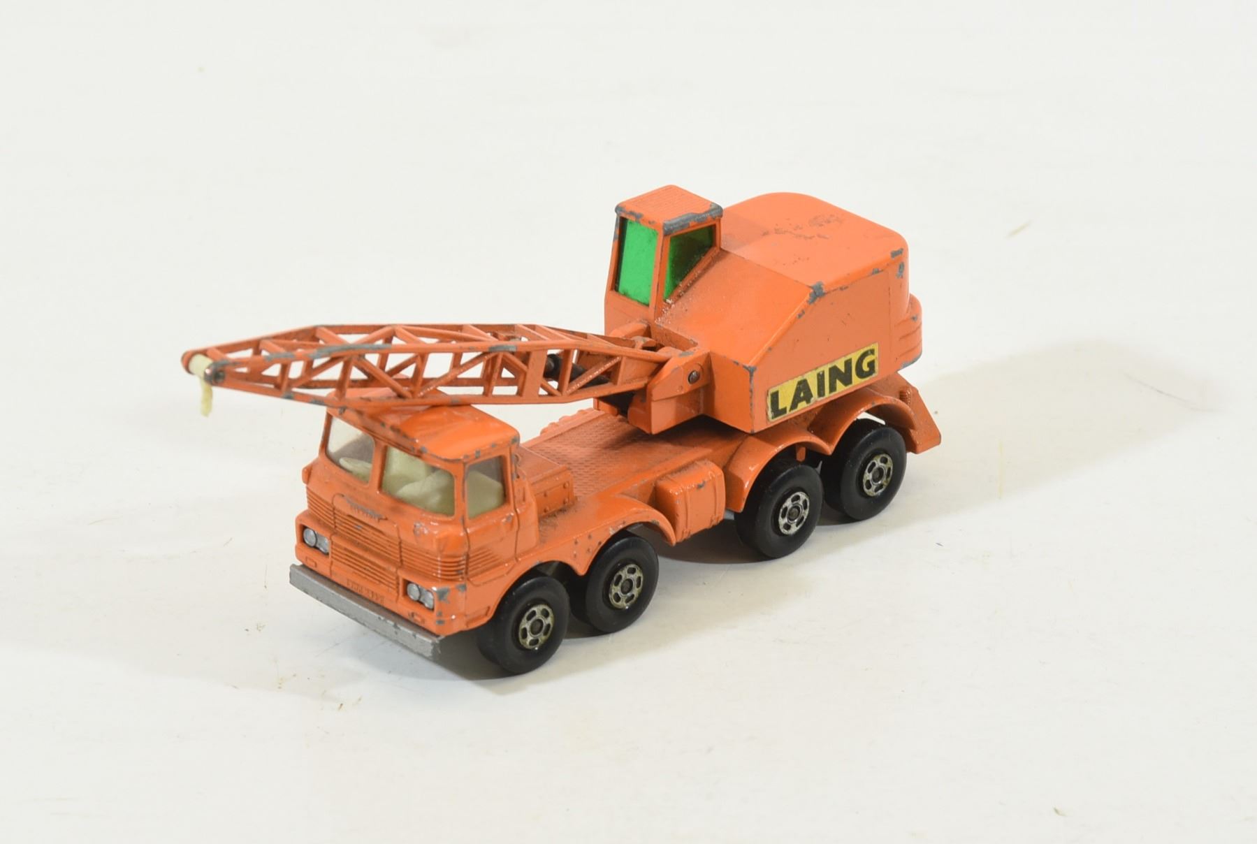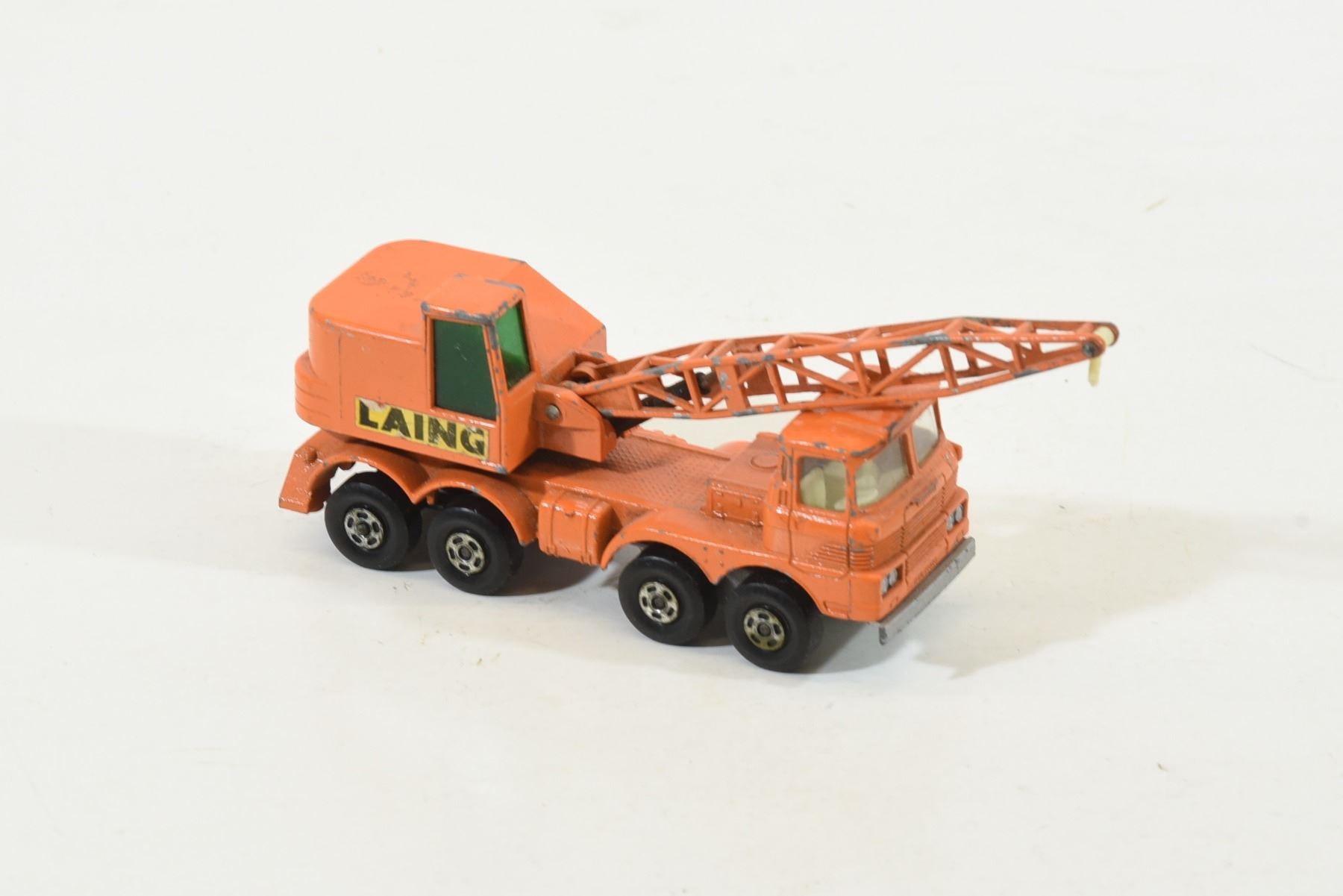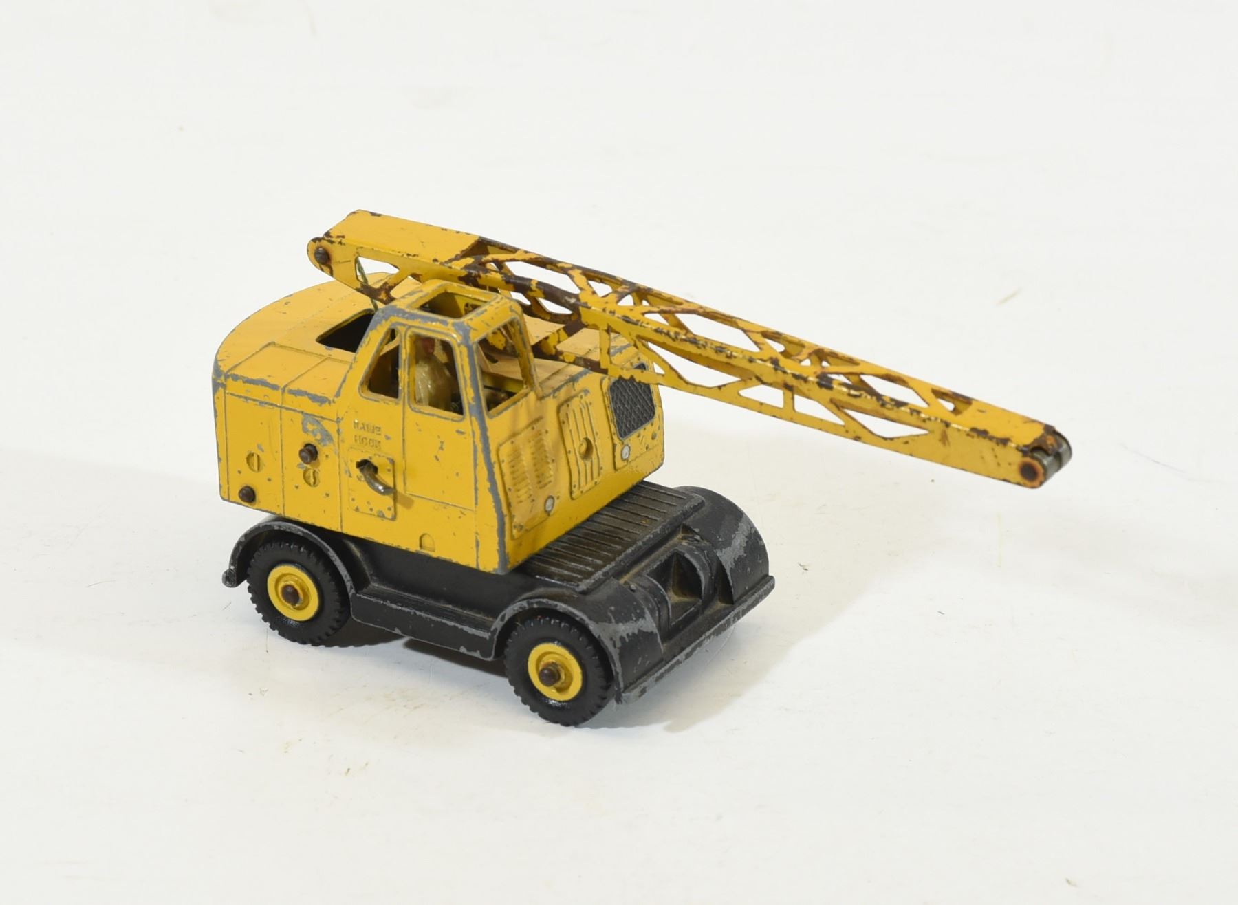 1) Dinky Supertoys mobile crane #571. The jib is damaged, but works. The handle for the hook is broken off and the hook is missing. 2) Dinky Supertoys 20 ton lorry mounted crane. The jib and hook both raise and lower. Made by Meccano. 3) Matchbox Super Kings K-12 mobile crane. Made by Lesney.