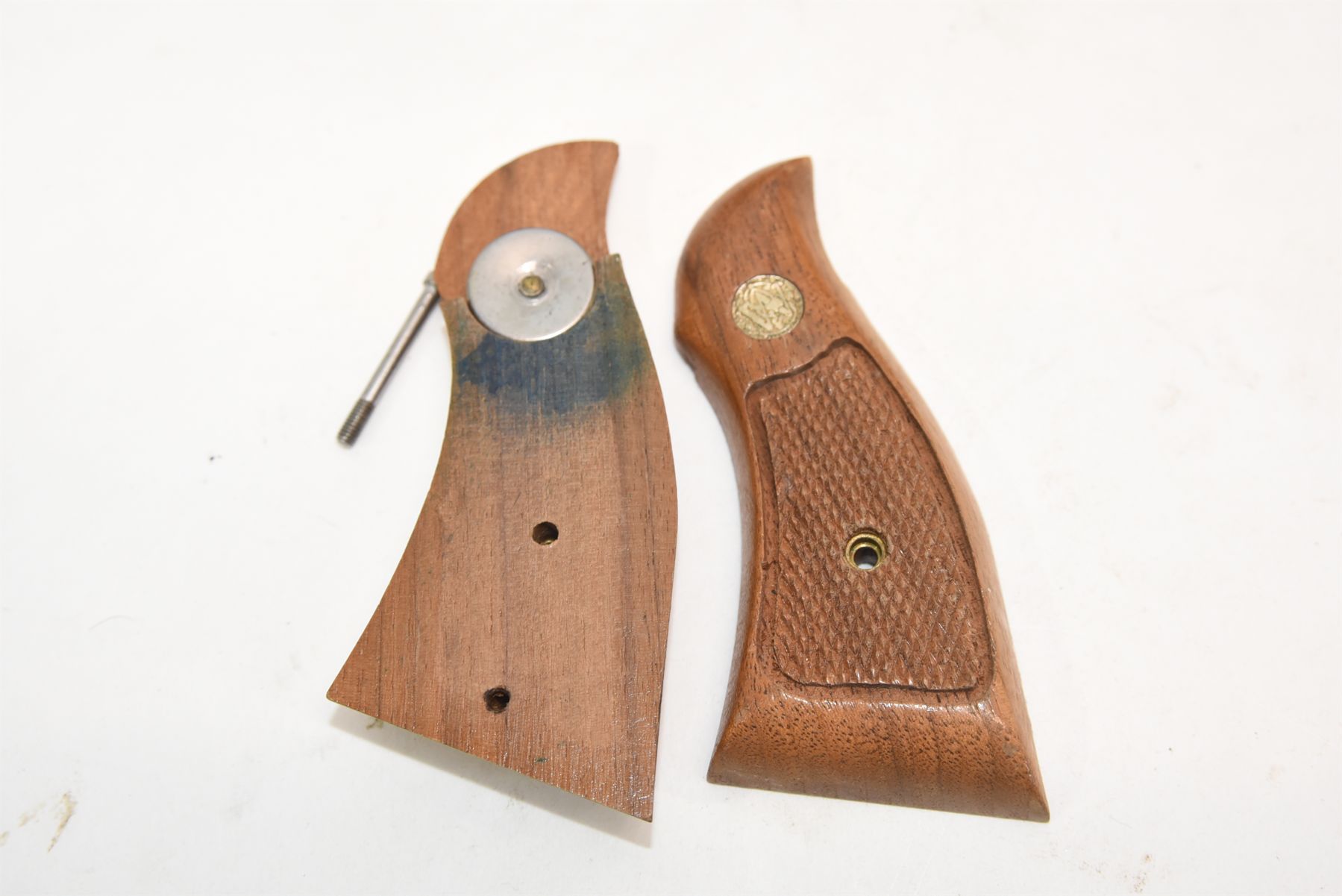 Smith and Wesson Pistol grips possibly K-series. May fit other models. Walnut with checkering and gold like S&W emblem inlaid.