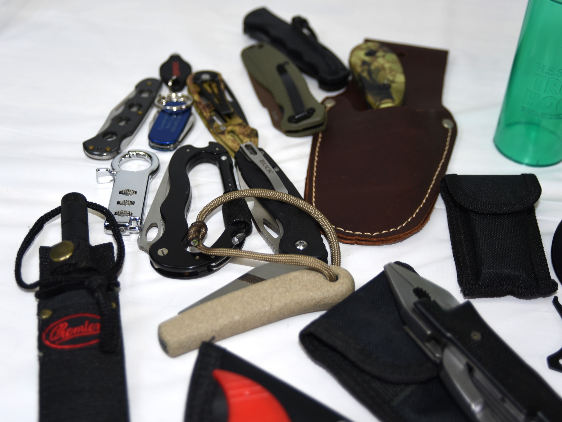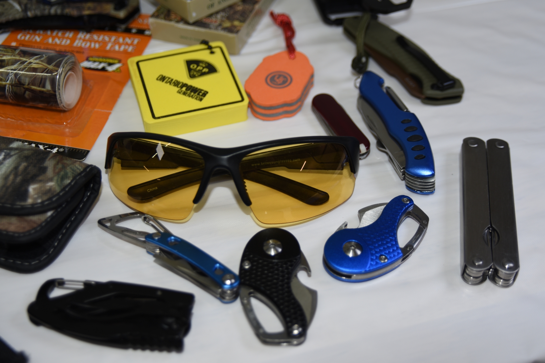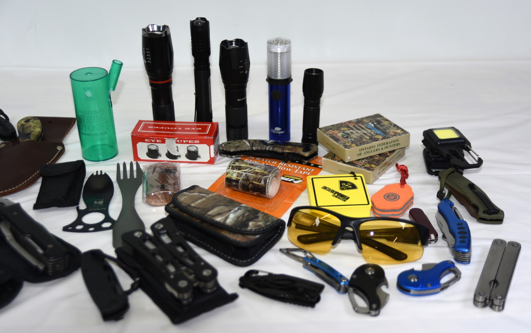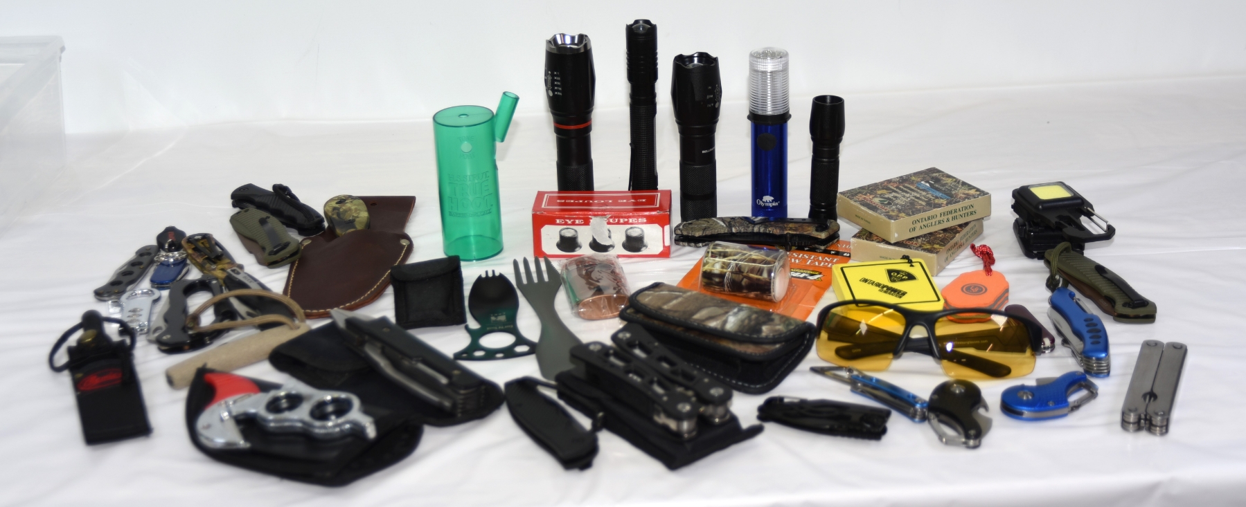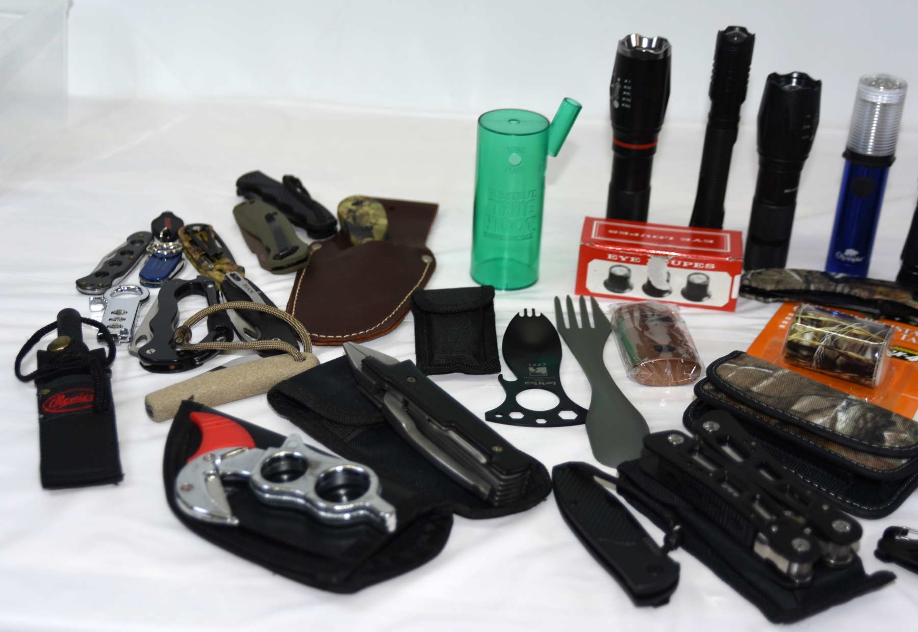 Box Lot Various Knives, Lights, Camo Face Paint, Playing Cards, Sunglasses