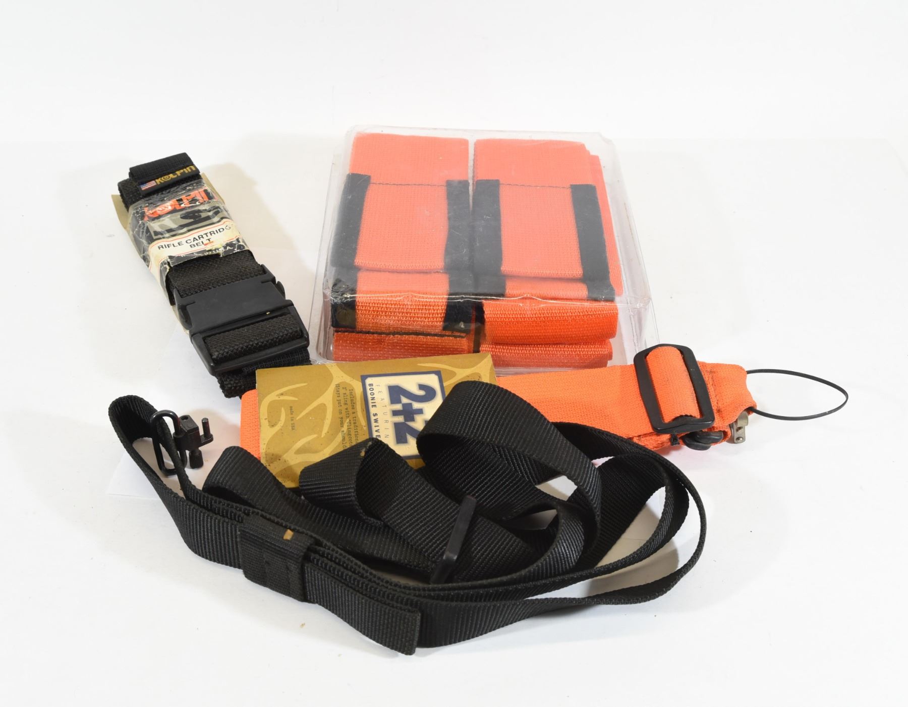 1) Orange H.V. rifle sling with Q.D's. 2) Black Whalen rifle sling with Q.D's. 3) Rifle cartridge belt. 4) Heavy Harness diag system.