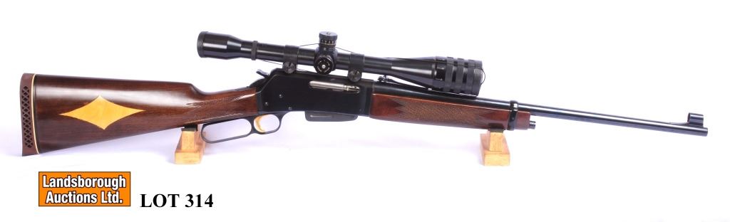 Non-restricted, lever action, 243 cal., 20" barrel, SN 02655RP127, wood is very good but has had a maple coloured diamond inlayed on the right side of the butt stock, bluing is excellent, bore is excellent, comes with a Weaver T-16 Micro-Trac scope.