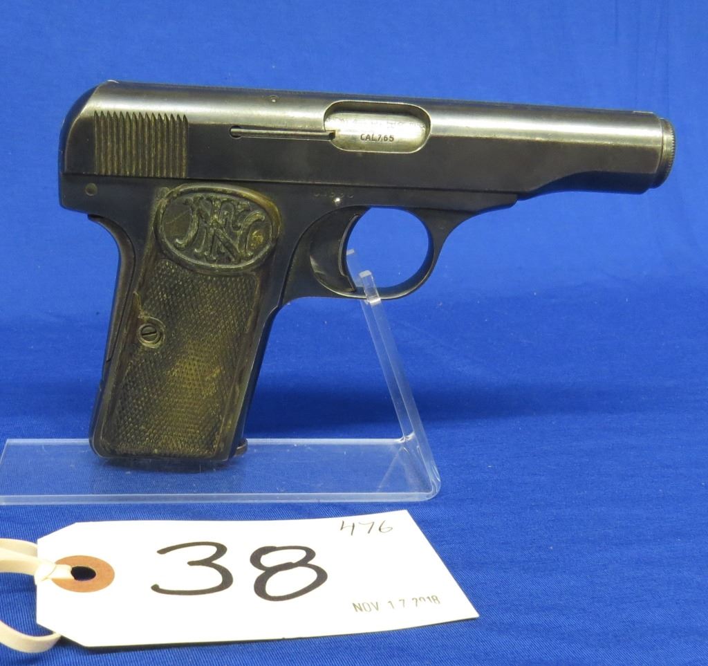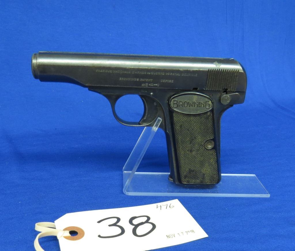 Prohibited, semi auto, 7.65mm, 89mm barrel, SN 52998. Left grip labelled Browning, right grip marked FN, bluing is grey with some pitting, bore has pitting.