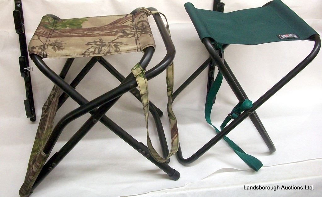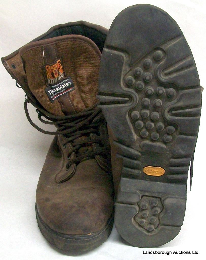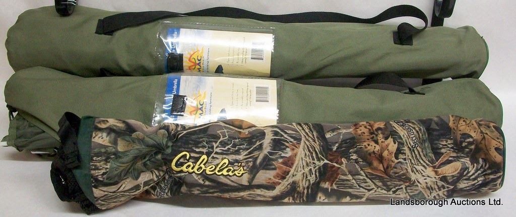 TWO MAC SPORTS BEACH UMBRELLAS, CABELAS FOLDING CAMO CHAIR, WORLD FAMOUS FOLDING STOOL, GAME TRACKER FOLDING STOOL AND A PAIR OF MENS KODIAK BOOTS SUSPECT SIZE 9.