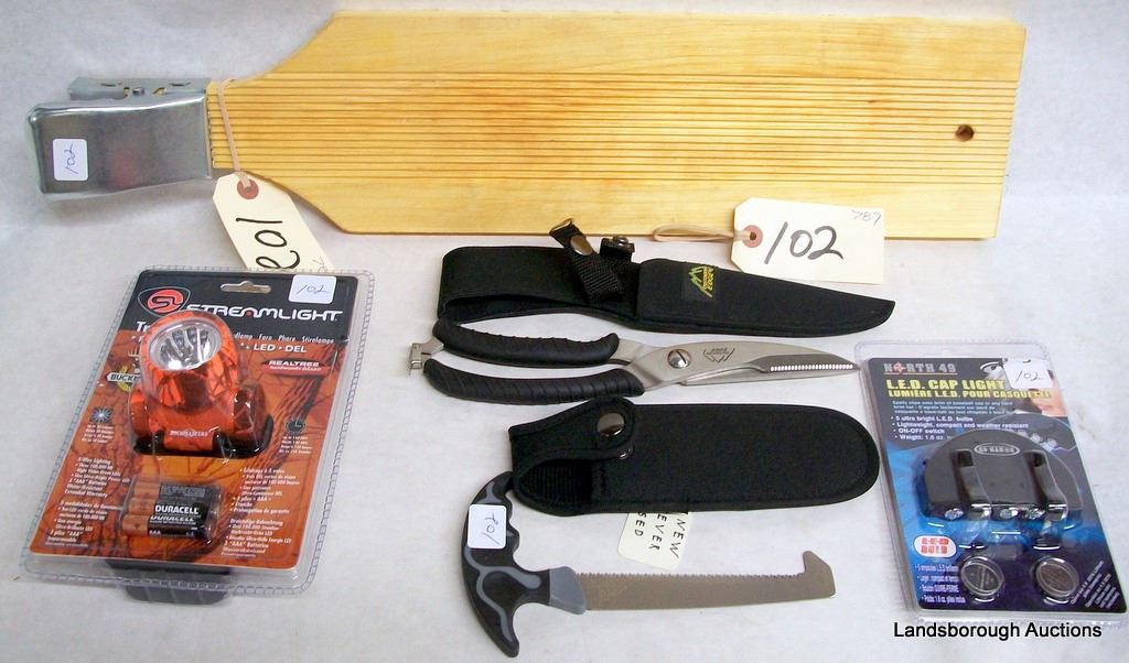 NEW STREAMLIGHT LED HEADLAMP, NEW NORTH 49 CAP LAMP, NEW GERBER MINI SAW, NEW OUTDOOR EDGE SHEARS, NORTH 49 PACK PONCHO, CAMO FANNY PACK, NEW SOLAR BATTERY CHARGER, FISH SCALER BOARD.