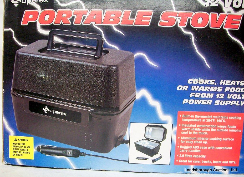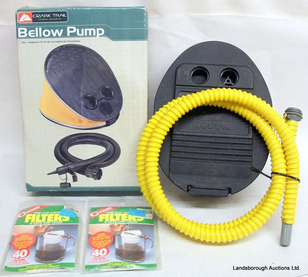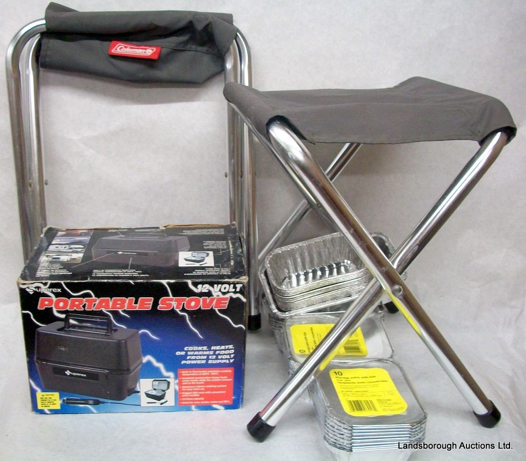 TWO COLEMAN FOLDING STOOLS, PORTABLE 12 VOLT STOVE WITH ALUMINUM COOK TRAYS, ONE CUP COFFEE FILTERS, TWO BELLOW PUMPS