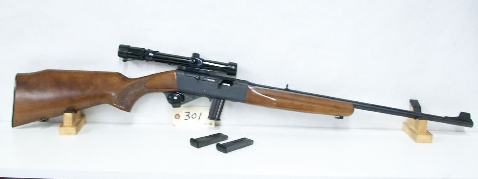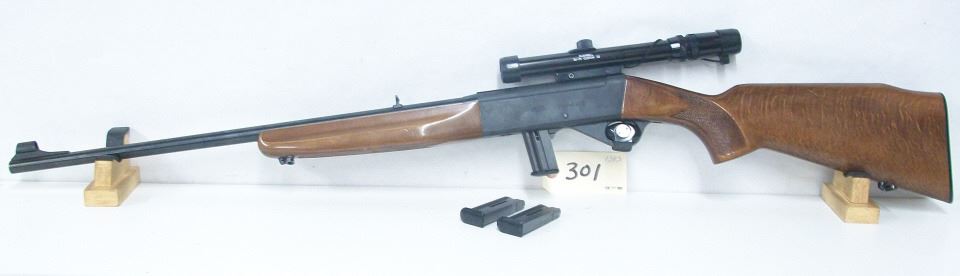 Non-Restricted, semi auto, .22 L.R, 20 inch barrel. Serial number 061635. Wood has handling marks, blueing is very good, bore is very good. Comes with 3 Anschutz 10 round mags, Bushnell 3x7 Custom .22 scope.
