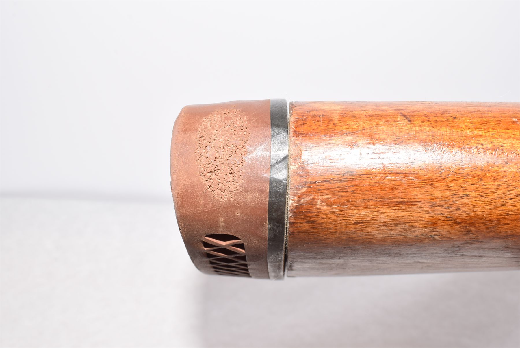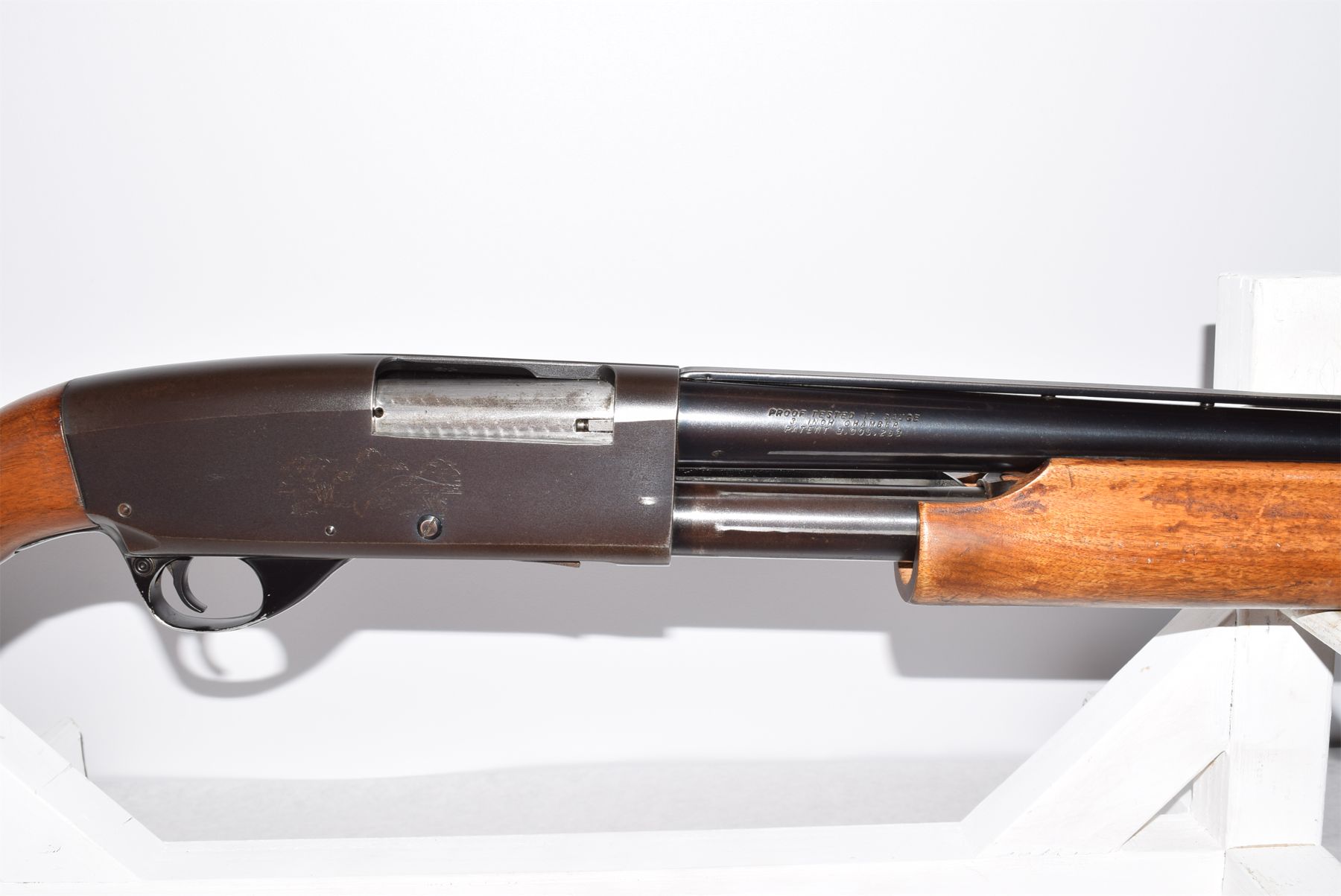 Wood shows lots of scratches, dents, scuffs, recoil pad is coming loose; overall condition is good for age. Bluing shows light rust, scratches, finish wear, overall condition is good. Bore is shiny and in good condition.