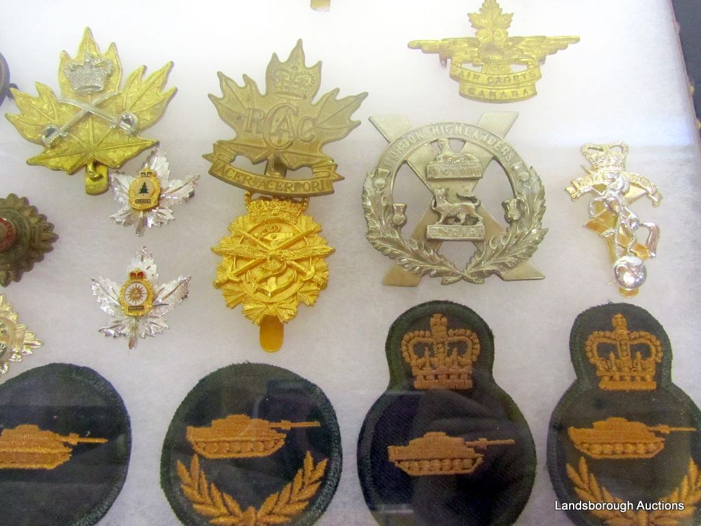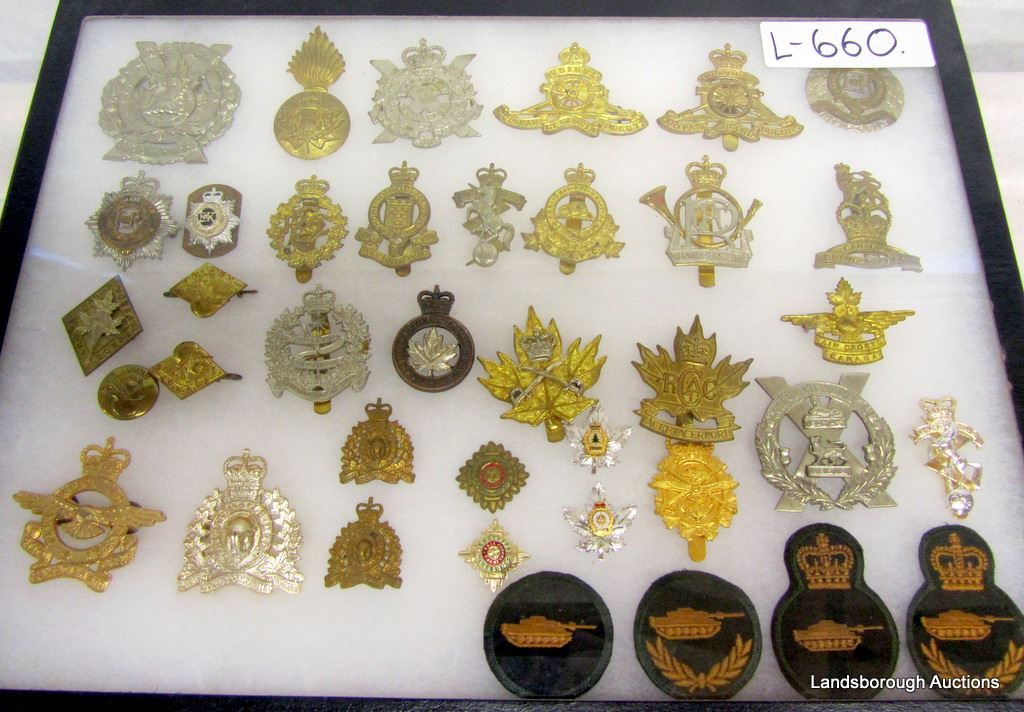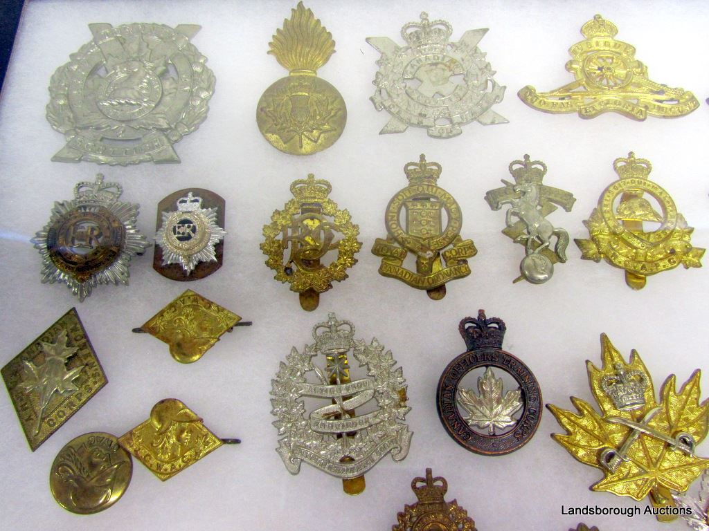 2 SETS OF COLLAR DOGS AND 34 HAT BADGES.