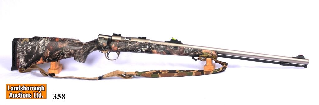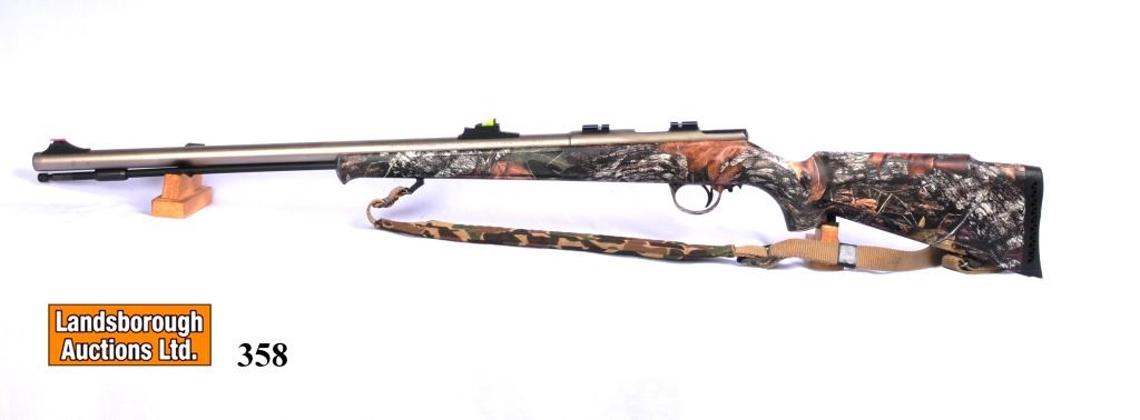Non-Restricted, single shot, 45 Percussion, 26" barrel, SN 611321768102. Synthetic camo stock veru good, stainless barrel has some pitting, bore has pitting and corrosion.