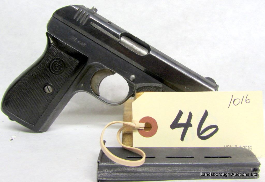PROHIBITED, SEMI AUTO, 7.65MM, 98MM BARREL, SN 568991. PLASTIC GRIPS HAVE SOME MARKS, BLUING IS FADED, BORE VERY GOOD.