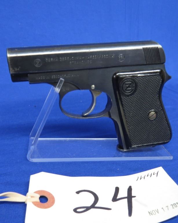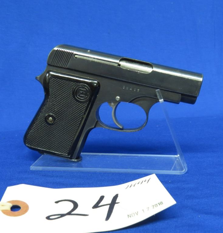 Prohibited, semi auto, 6.35mm, 64mm barrel, SN 98497. Grips have a chip, bluing worn with pitting near muzzle, bore has pitting.