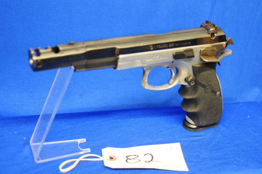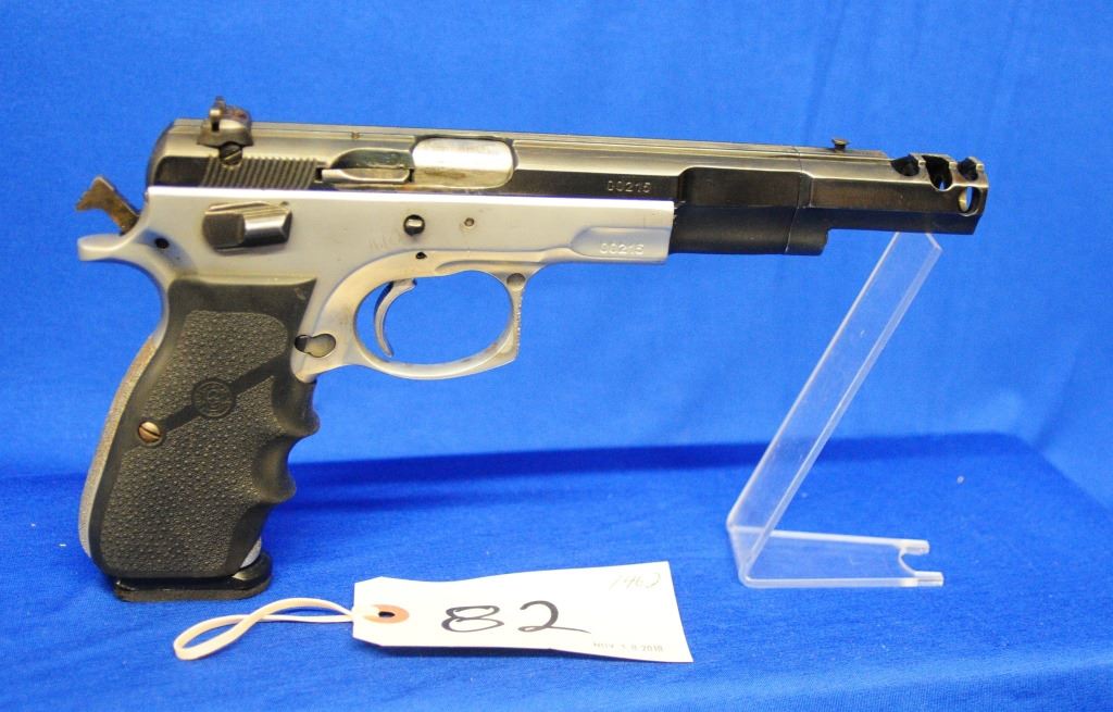 Restricted, semi auto, 9mm Luger, 138mm barrel, SN 00215. Hogue rubber grips very good, metal work has some scratches and fading, bore very good.