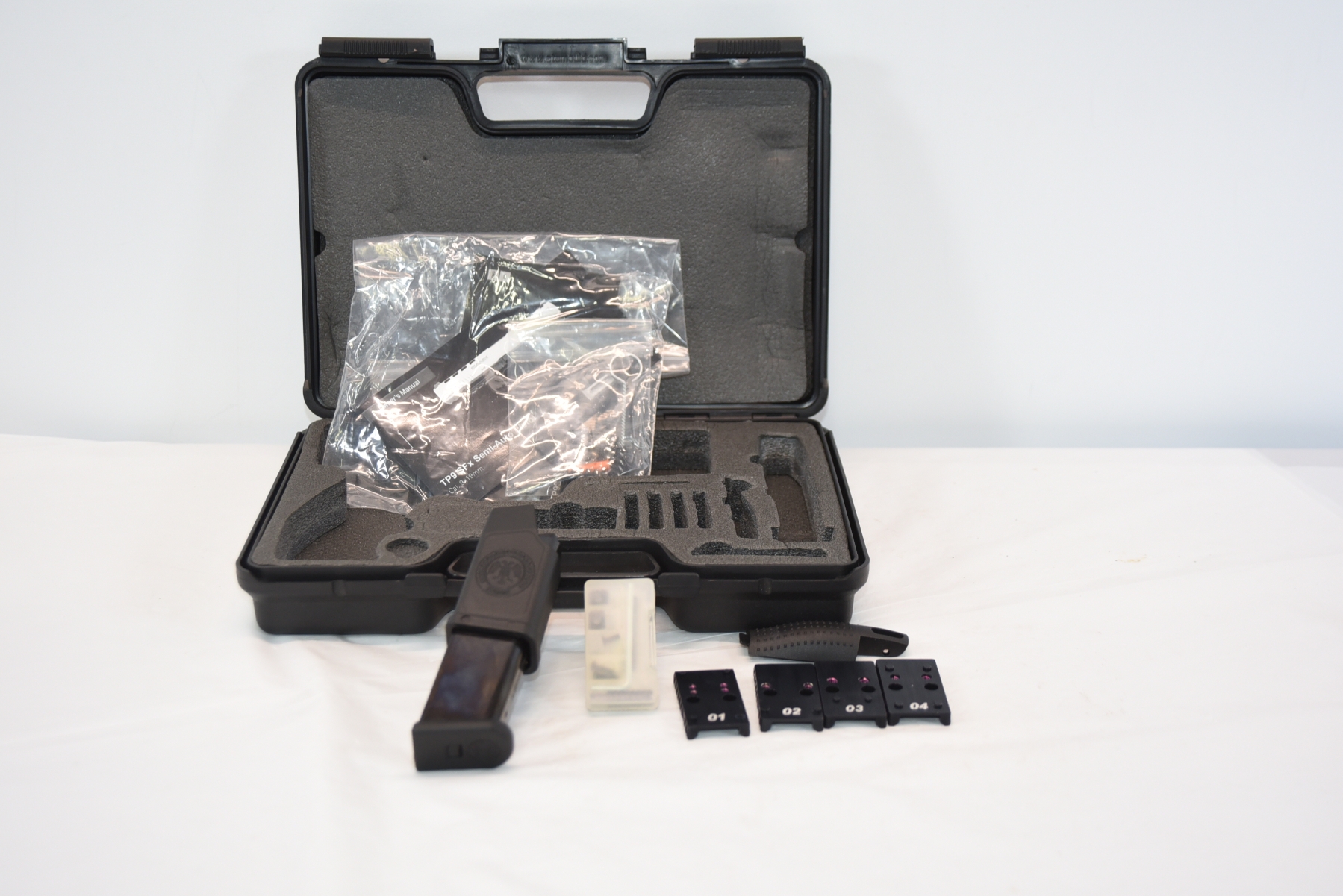 Firearm comes with 2 magazines total, spares, back strap, case.