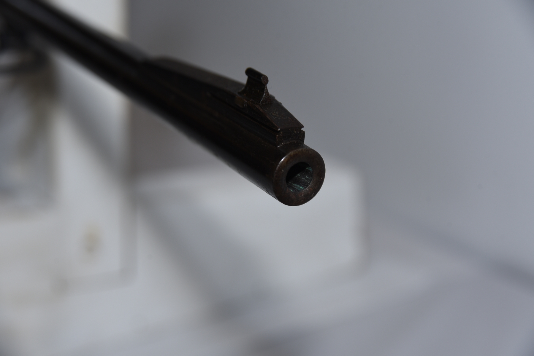 Metal finish shows rust spots throughout, scratches, scuffs, finish wear areas, rear sight is missing; condition is fair.