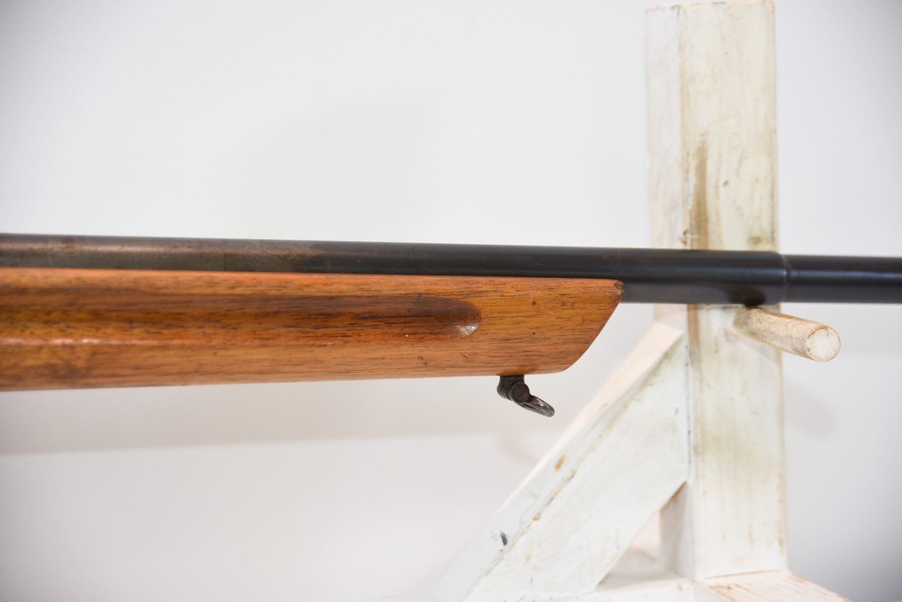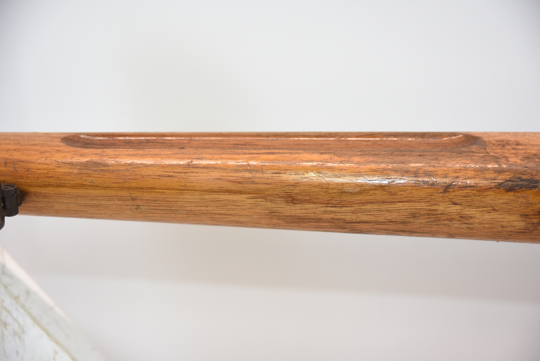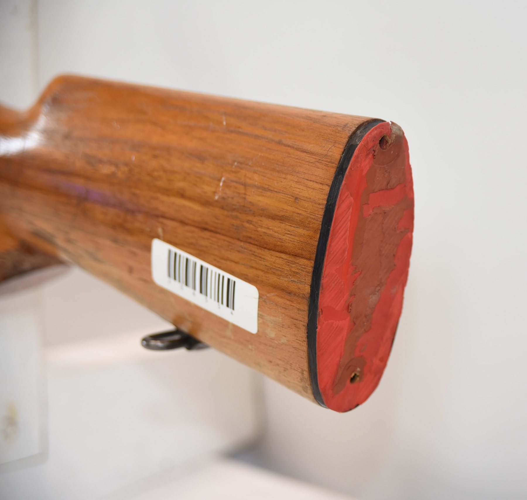 Wood stock show a modification to the grip, there are scratches, scuffs, dent on most of the stock. Butt plate is missing. Condition is fair.