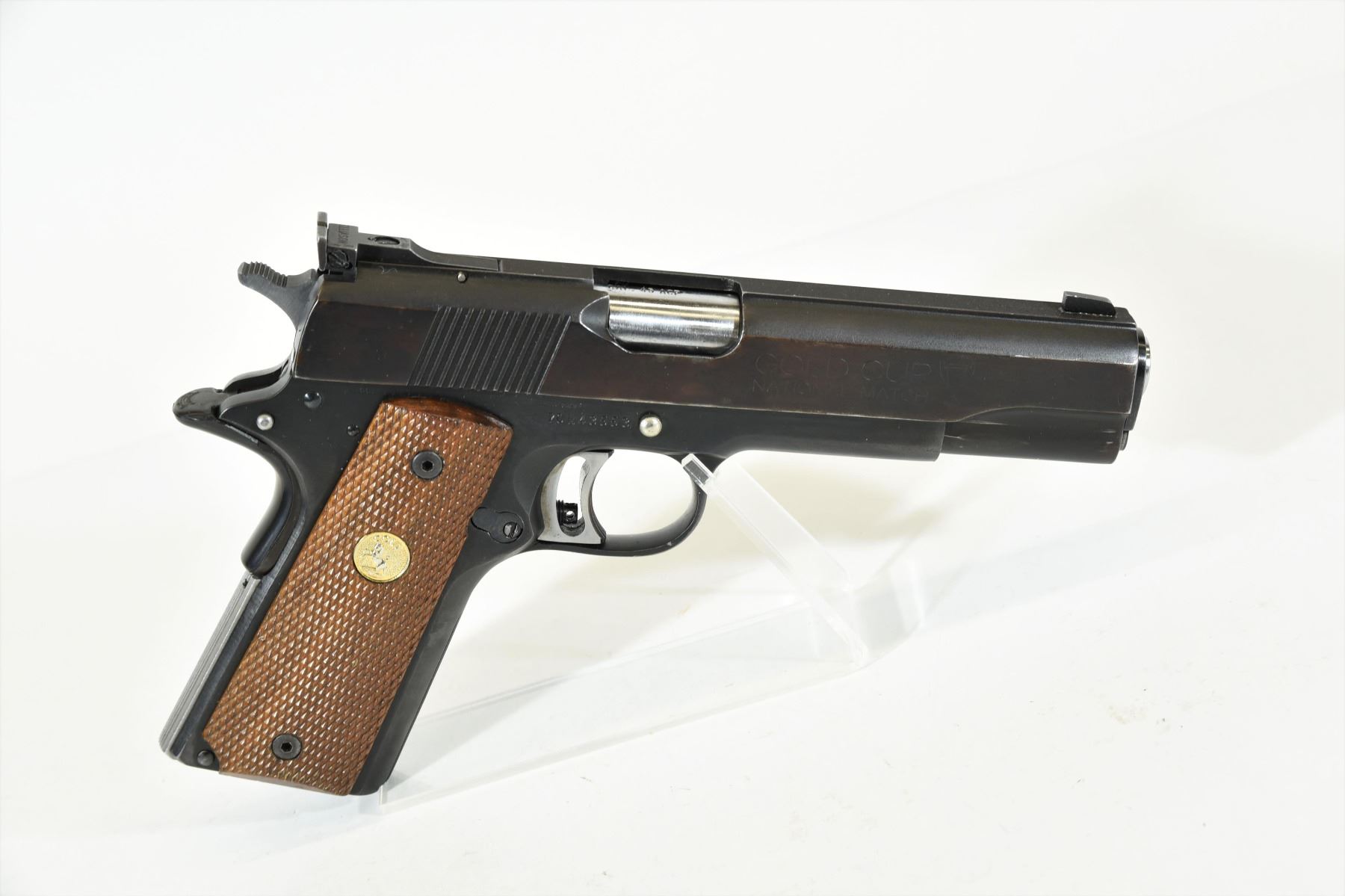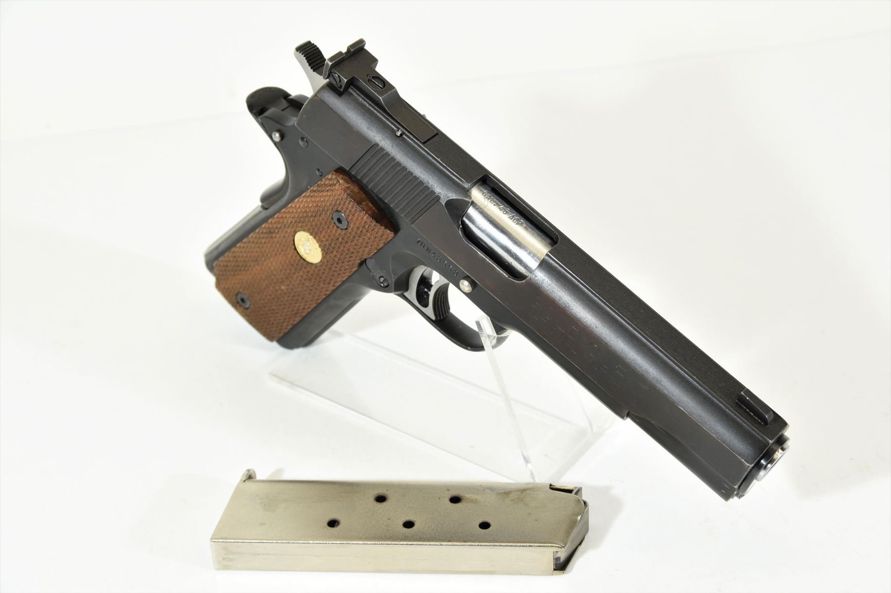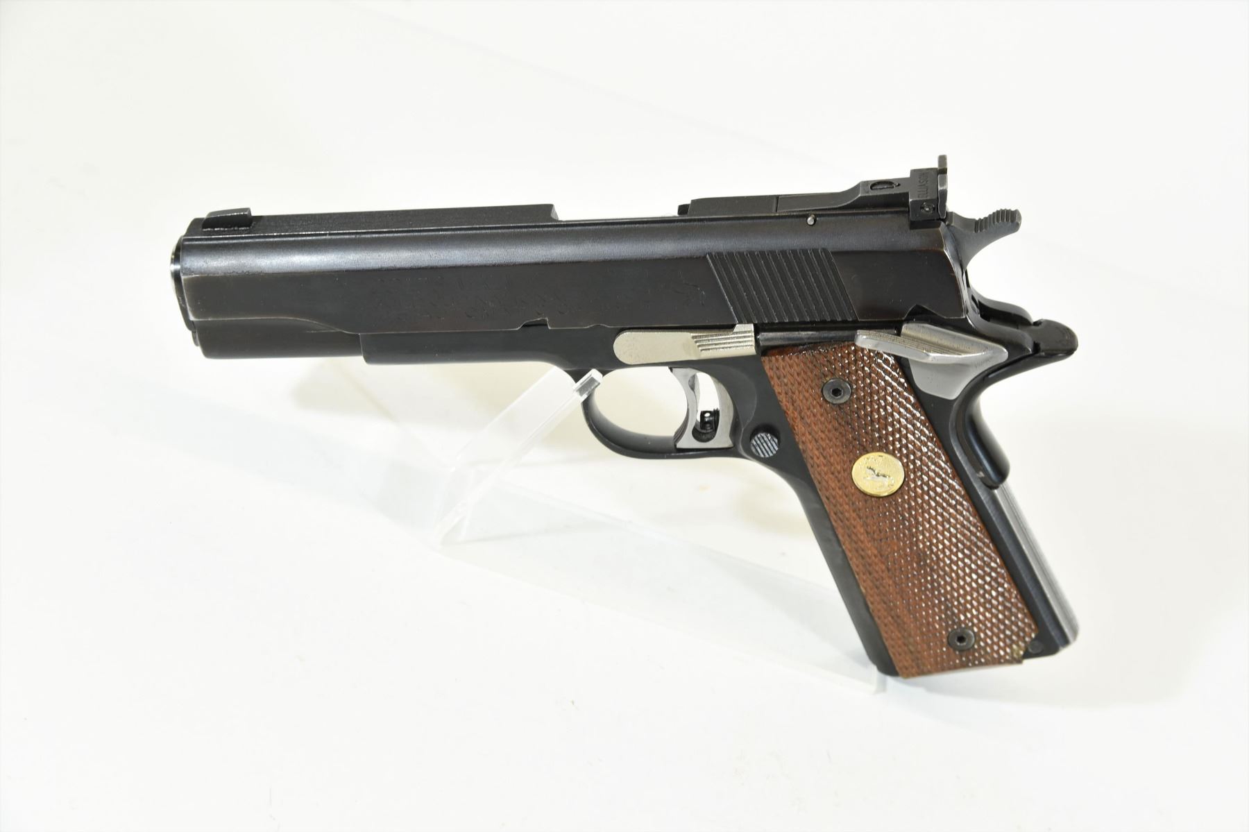 Restricted, semi auto, 45 Auto, 127mm barrel, SN 70N43553. Wood grips very good, bluing is fading with some light pitting, bore good.