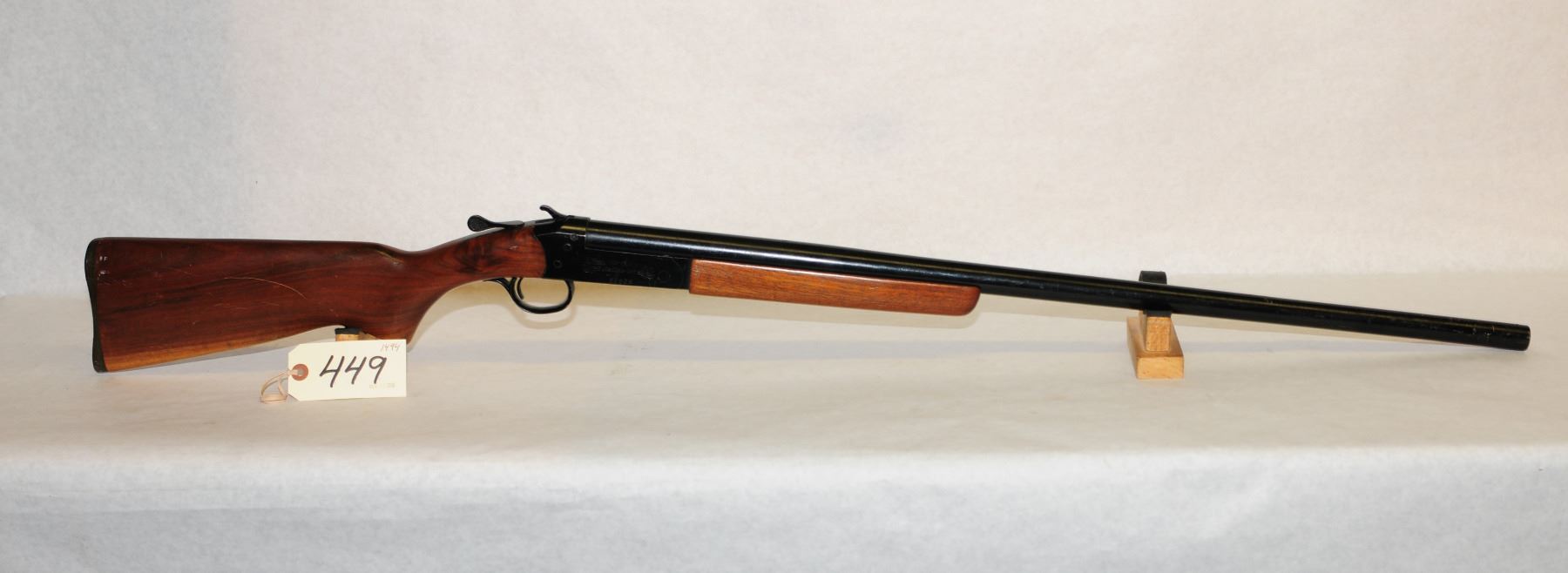Non-restricted, single shot, 12Ga x 2 3/4", 30" barrel with fixed full choke, SN 51626. Wood has a dent and some scratches, bluing painted black, bore good. Missing front bead.