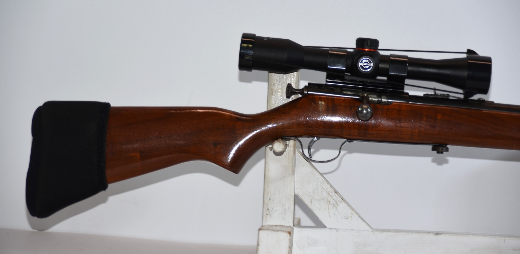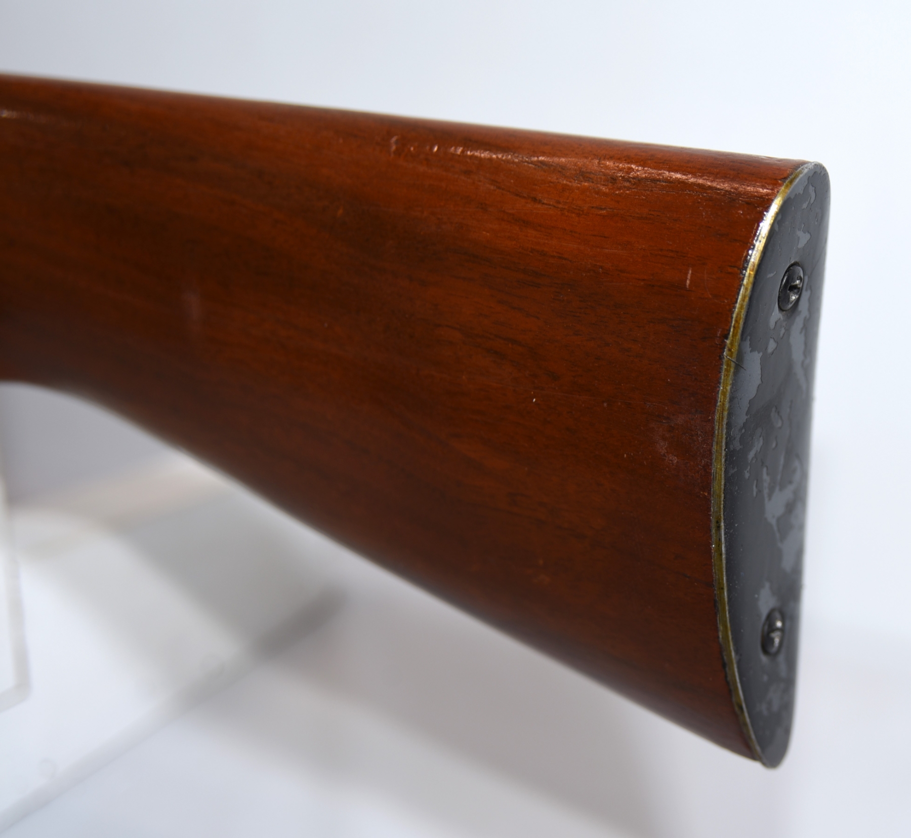 Wood stock shows scratches and scuffs, few light dents; condition is very good. Butt plate has a cover.