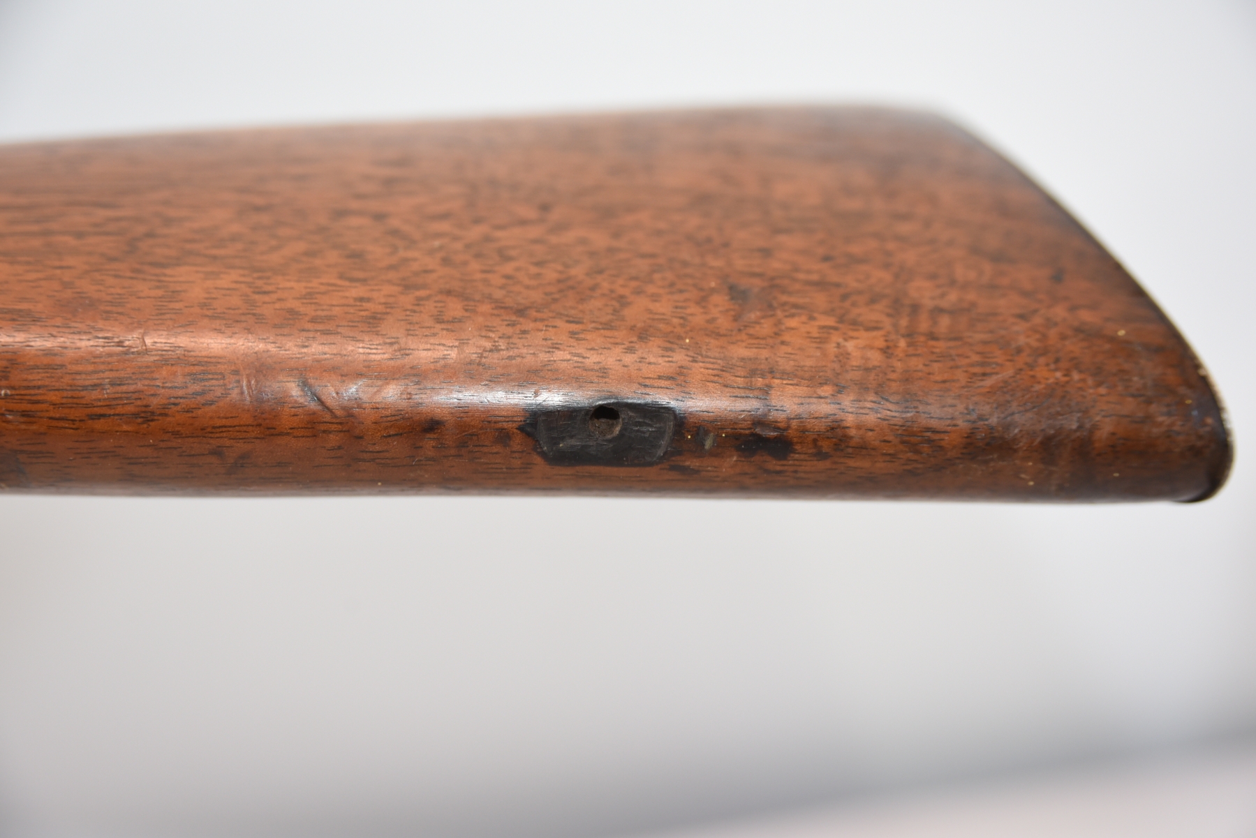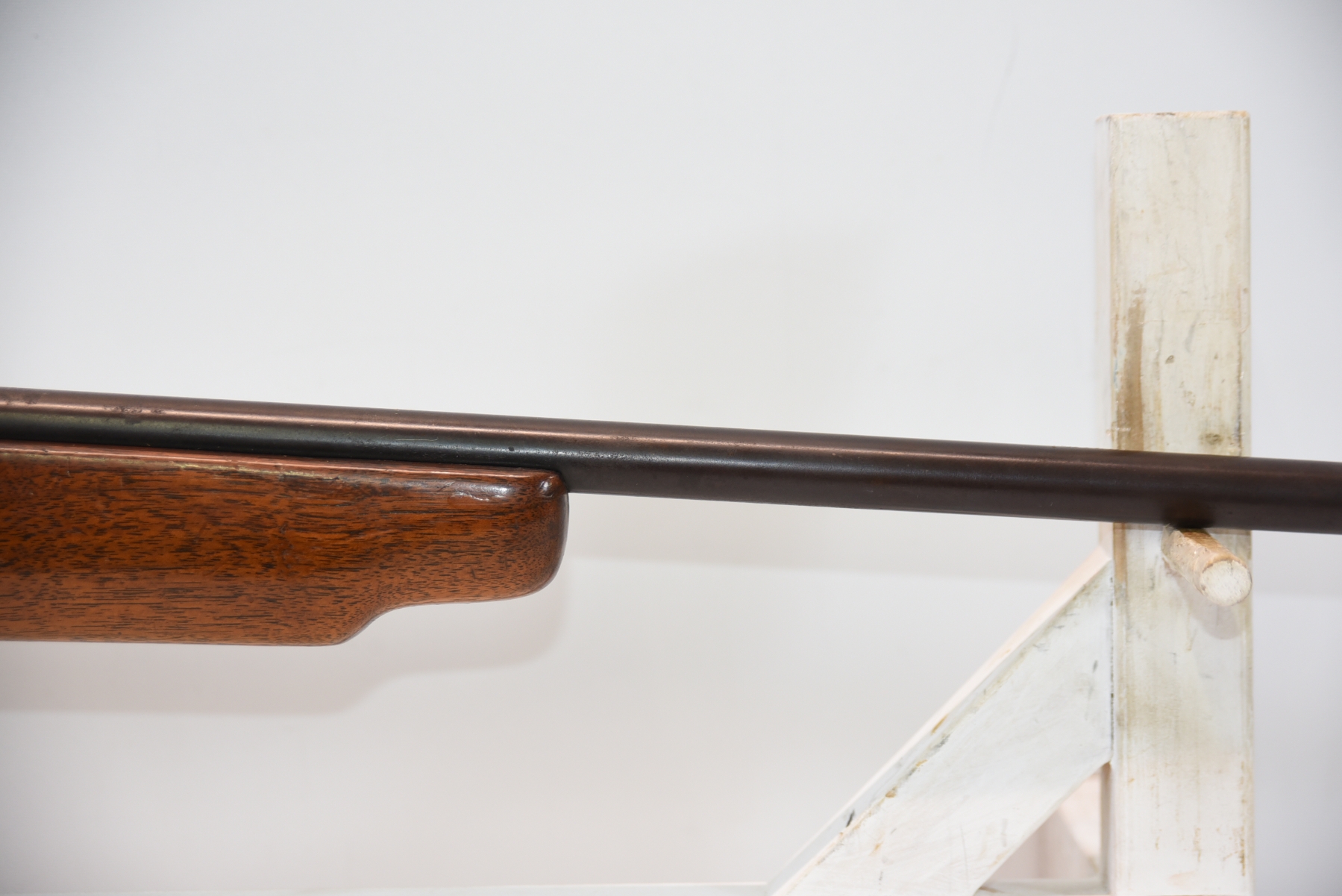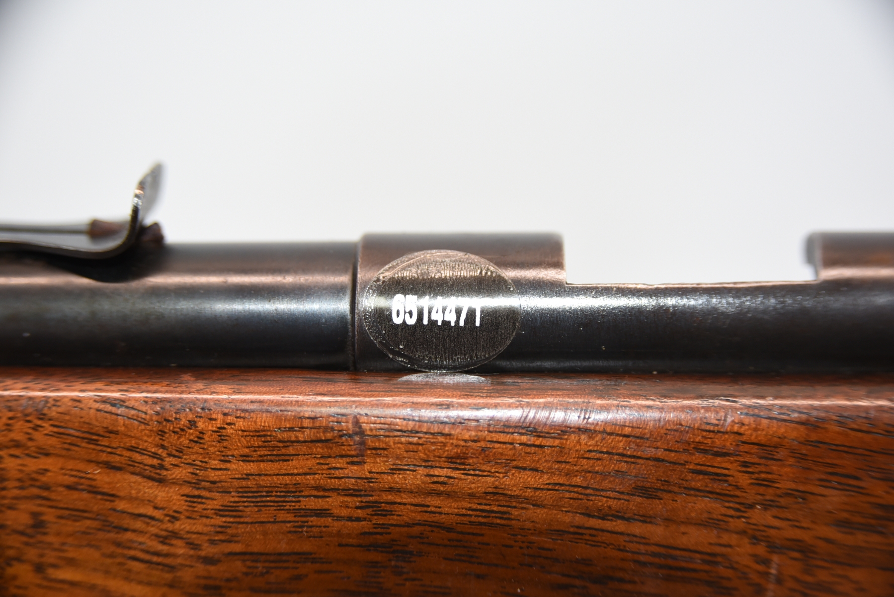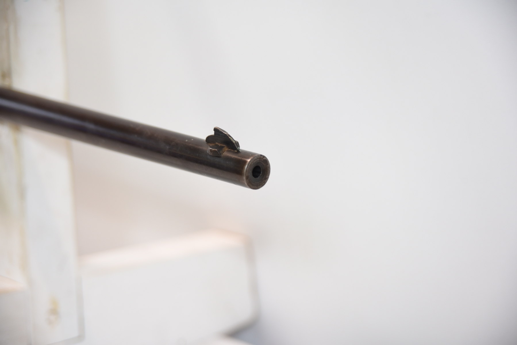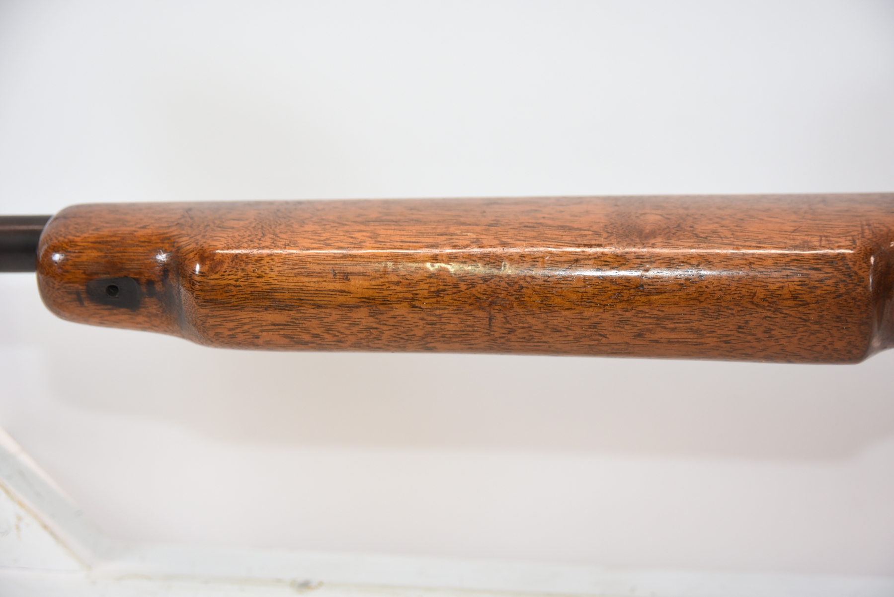 The wooden stock has a number of scratches, dents and chips on both sides as well as the top and underneath. The bottom side does have a small drilled hole in it where the sling swivel would go. The wooden forearm has a number of scratches and dents on both sides as well as the underneath. The forearm also has a small hole drilled into it where the sling swivel would go. The bluing appears to look like it used to be shiny but the gloss is worn down. The bluing has a number of scratches, scuffs, chips and some rust pitting. The bore is shiny, the rifling is apparent and is in very good condition overall. The bolt is missing.