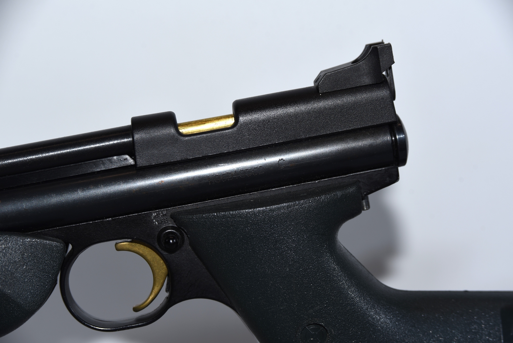 Metal finish shows some scratches and scuffs, some rust spots, front sight is missing, pressure is low; condition is fair.