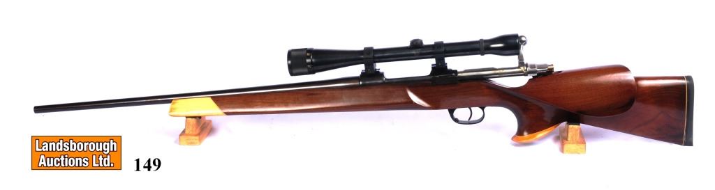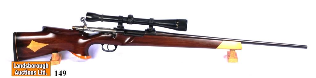 Non-restricted, bolt action, 22-250, 24" barrel, SN Z-38615, wood is a custom Judd stock in good condition, bluing has been refinished and due to high nickel content it is turning a purple colour, bore is excellent, comes with a weaver K12-C3 scope, gun has a custom Judd stock, custom barrel and a mauser action.