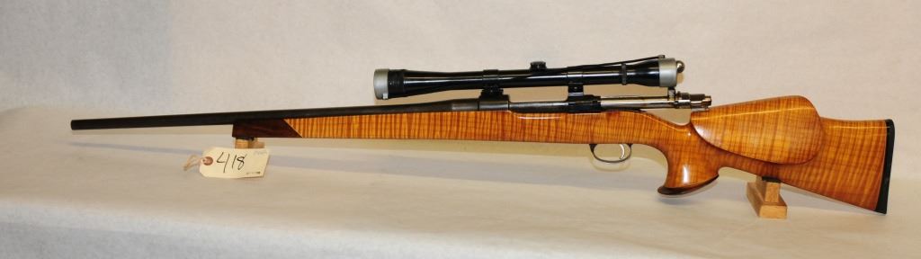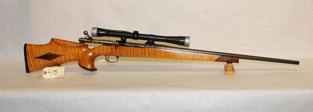 Non-restricted, mauser bolt action, .243 cal., 24" barrel, SN none, wood is a custom Judd stock in good condition, bluing is turning brown, bore is excellent, has a Weaver K10 60-b adjustable objective parallax rifle scope.