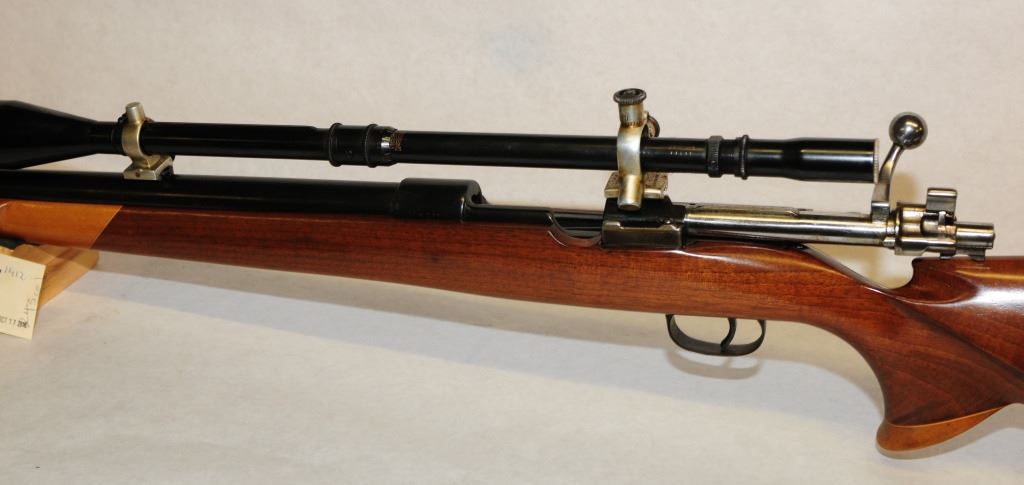 Non-restricted, mauser 98 bolt action, .243 cal., 25" custom bull barrel, SN 8701, wood is a custom Judd stock in very good condition, bluing is fair, bore is excellent, has a J.W. Fecker 11505 rifle scope