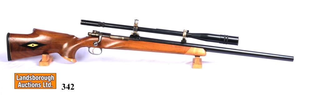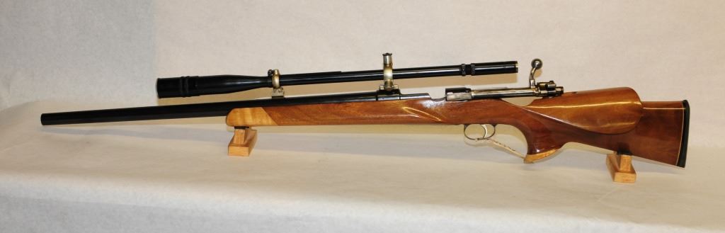 Non-restricted, bolt action, 22-250, 25" heavy barrel, SN 59345, wood is good, bluing is good, bore is excellent, has a 15 power spot-shot R.A Litschiert scope, gun has a custom Judd stock, a custom heavy barrel and a mauser 98 action, action is also stamped with an eagle over a swastika.