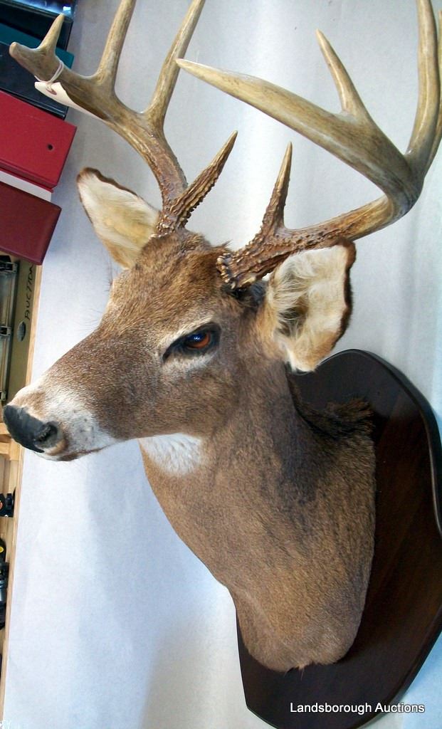 VERY WELL MADE 8 POINT BUCK ON MOUNT, MATCHING MOUNTED HOOVES. FROM BOTTOM OF BASE TO TIP OF ANTLERS IS APPX 43", AND IS APPX 20" WIDE. HOOF MOUNT IS 6 1/2"X32"