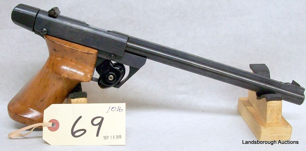 RESTRICTED, SINGLE SHOT, 22LR, 250MM BARREL, SN 44838. CUSTOM WOOD GRIPS ARE SCRATCHED, BLUING HAS SCRATCHES AND LIGHT PITTING, BORE EXCELLENT.