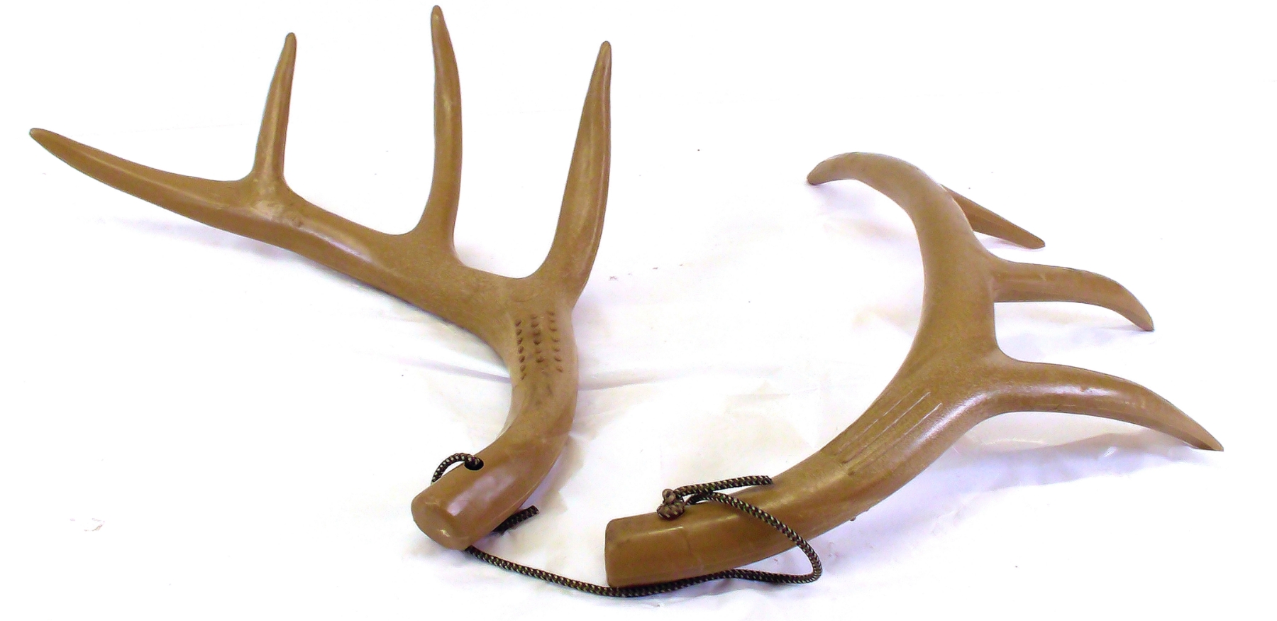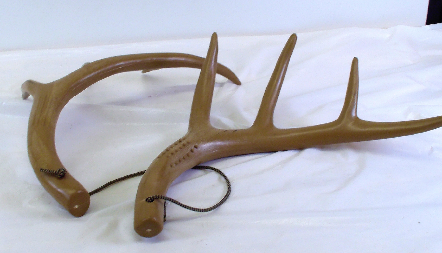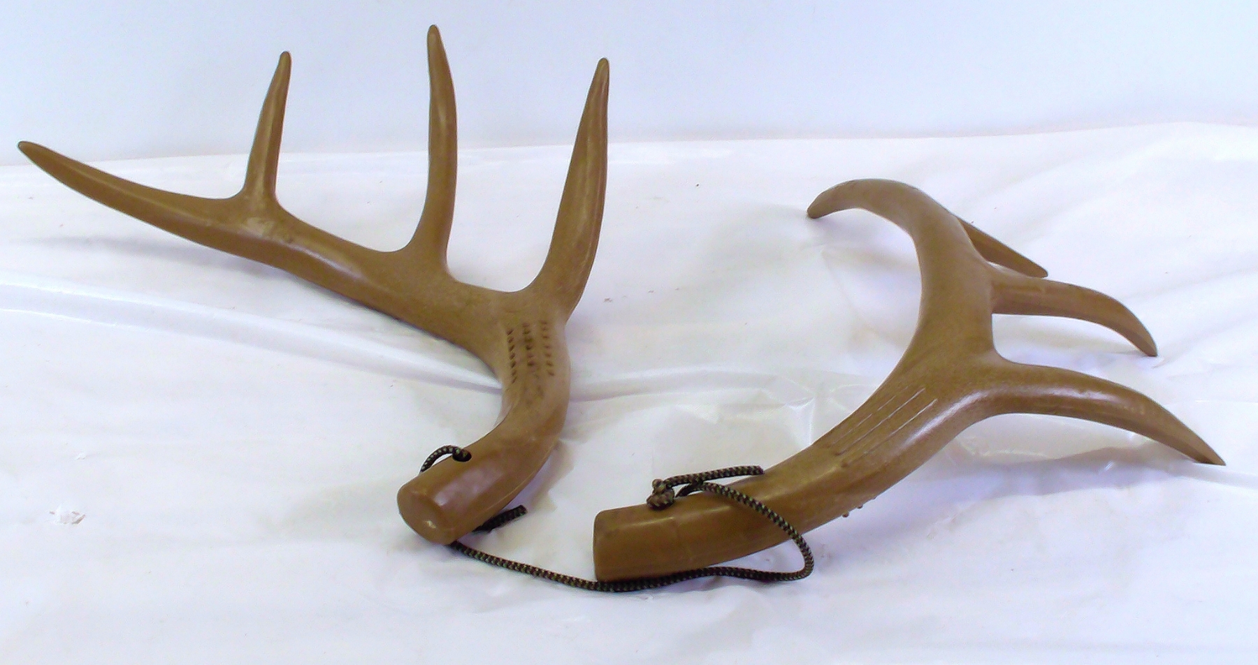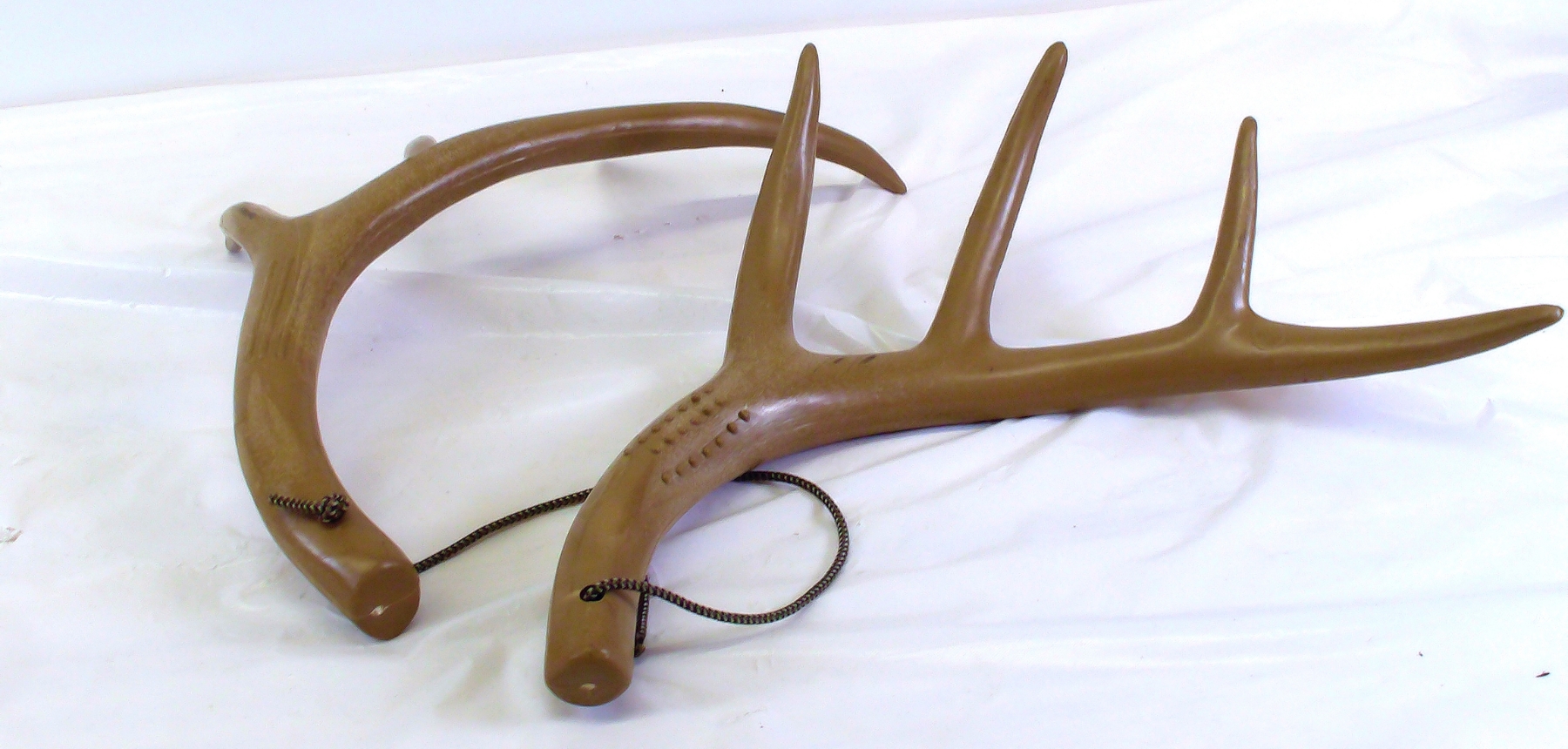 Each antler features multiple tines with molded texture simulating natural antler growth and burr detail near the bases. The surfaces show minor scuffs and light finish wear consistent with handling, but no major cracks or structural damage visible.