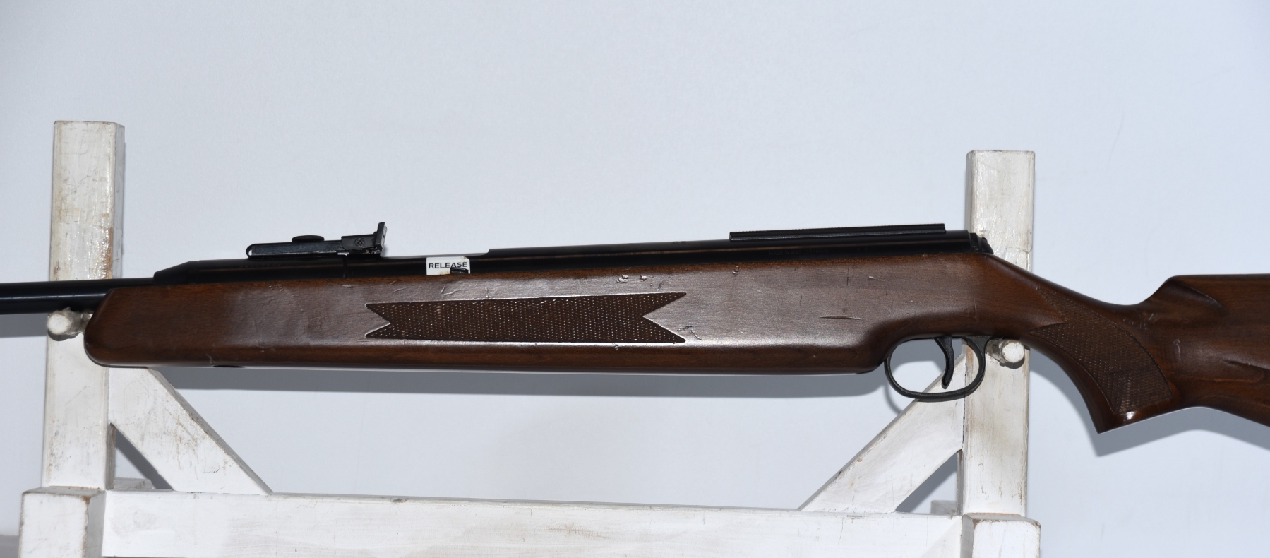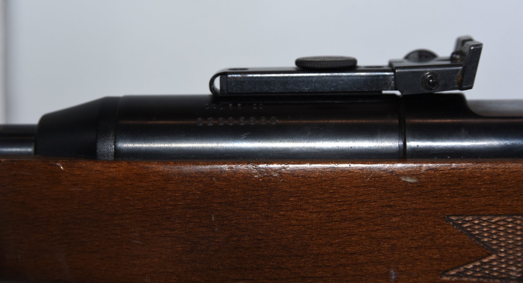 Metal finish shows scratches, scuffs, rust spots, cocking handle is loose and has a hardware screw; condition is good.