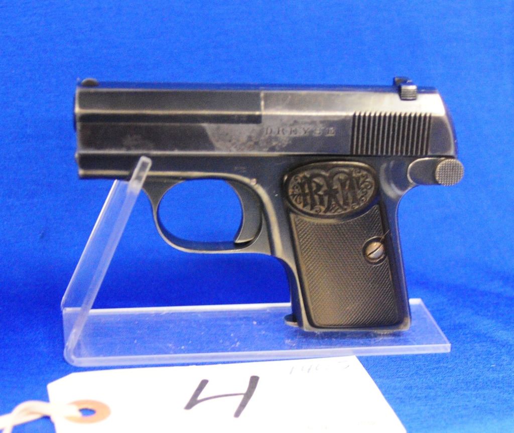 Prohibited, semi auto, 6.35mm, 51mm barrel, SN 9204. Plastic grips very good, bluing is grey and worn, bore dark.