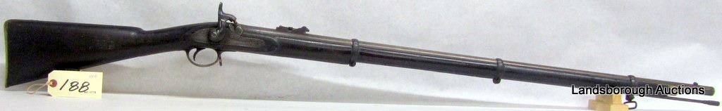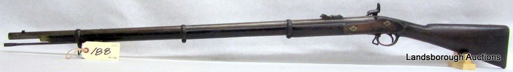 ANTIQUE, SINGLE SHOT, 577 PERCUSSION, 38" BARREL, SN NONE. WOOD HAS GOUGES AND DENTS, BLUING IS BROWN, BORE PITTED.