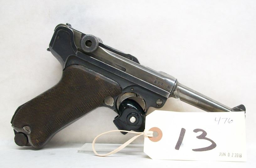 PROHIBITED, SEMI AUTO, 9MM LUGER, 102MM BARREL, SN 464M. WOOD GRIPS GOOD, BLUING IS WORN AND GREY, BORE VERY GOOD. SERIAL NUMBER MATCH EXCEPT MAG.