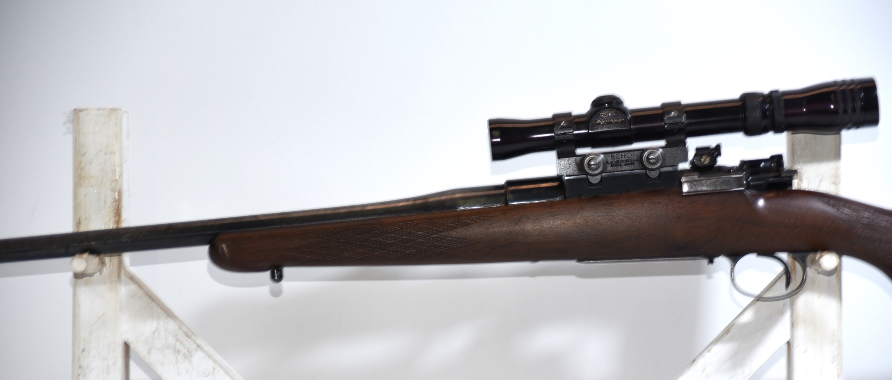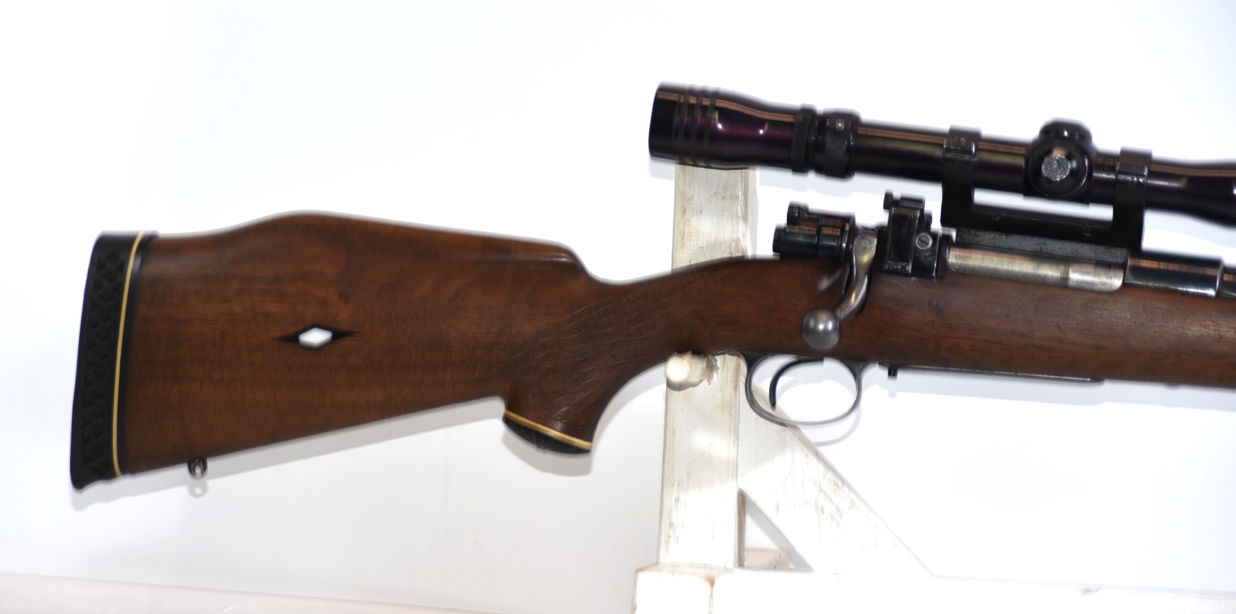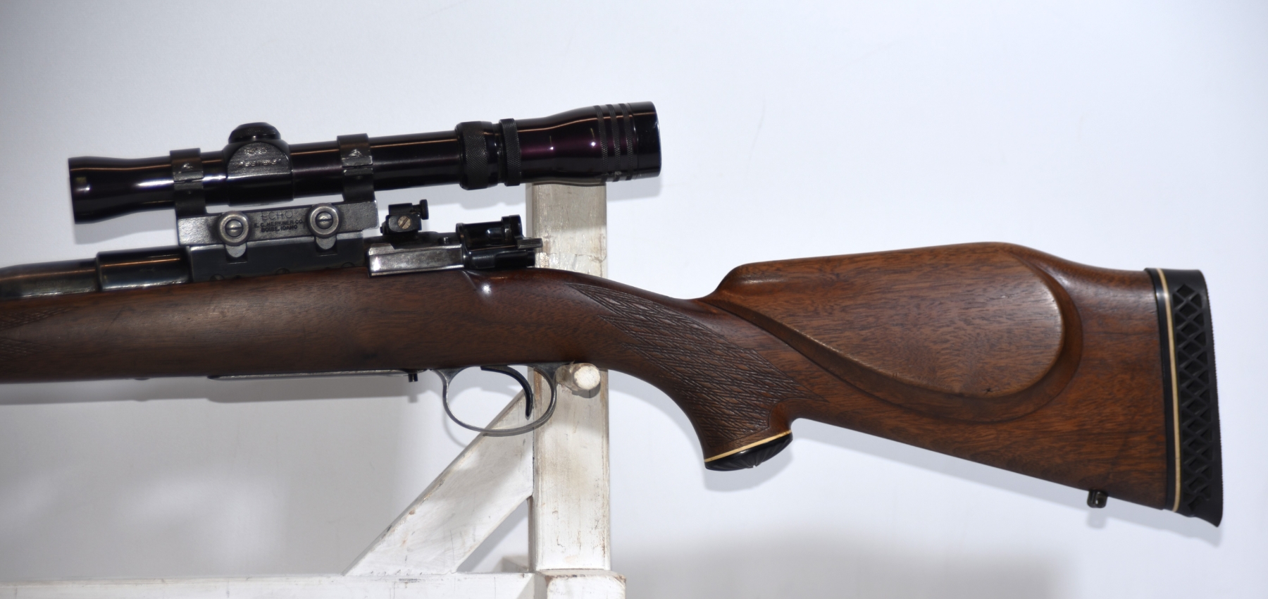 Wood stock shows light scratches and scuffs, few light dents, rubber butt pad has hardened; condition is very good.