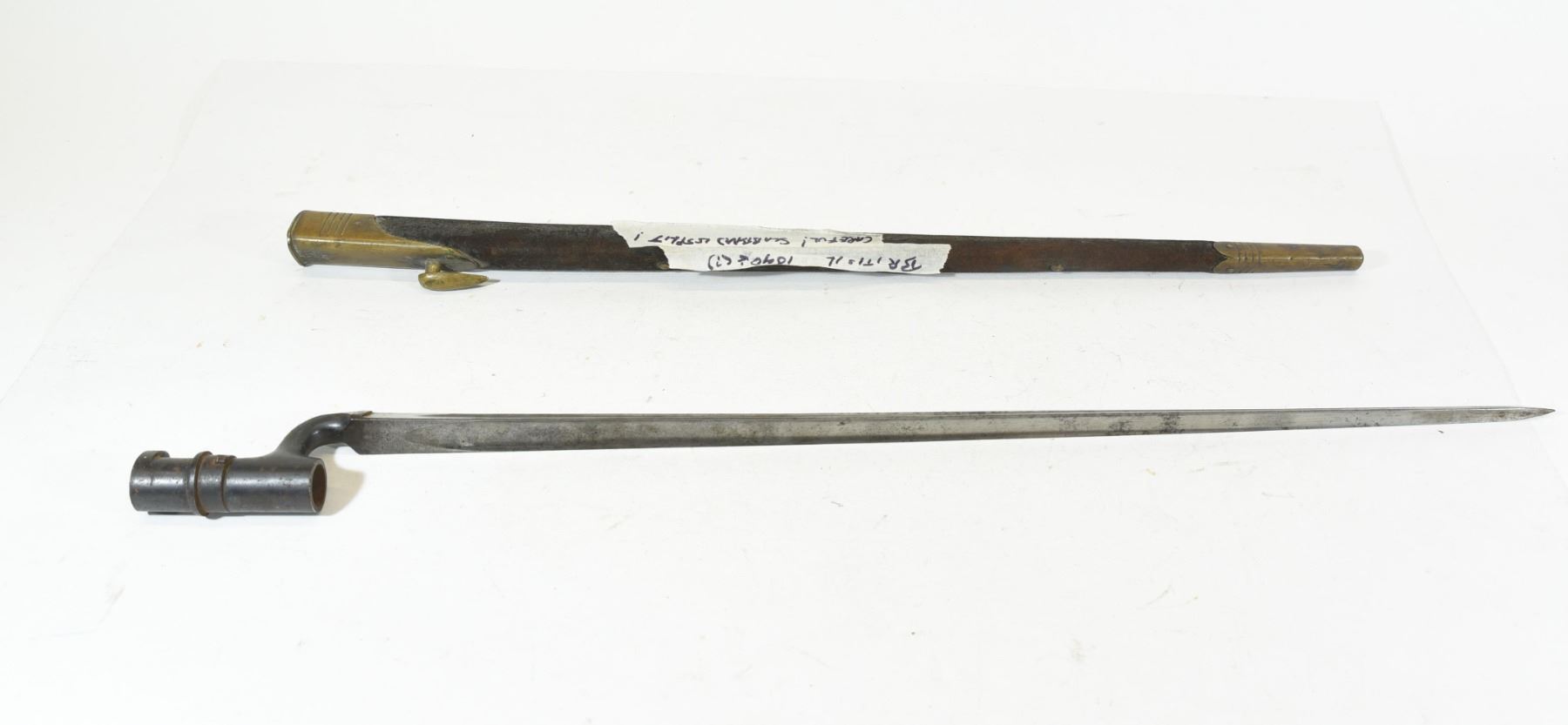 Socket bayonet with scabbard, bayonet is missing a piece where it locks on barrel and the scabbard has some stitching come apart.