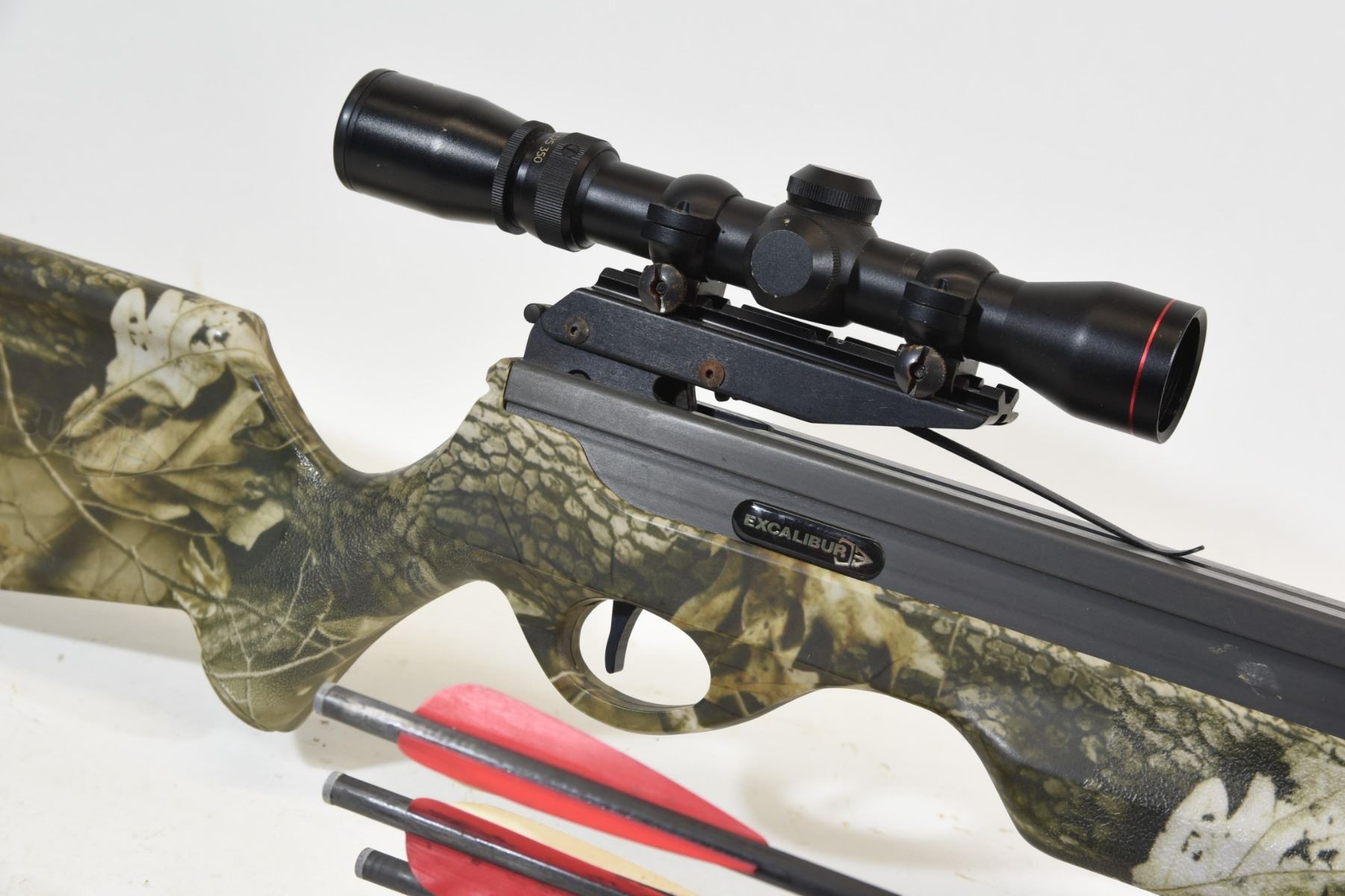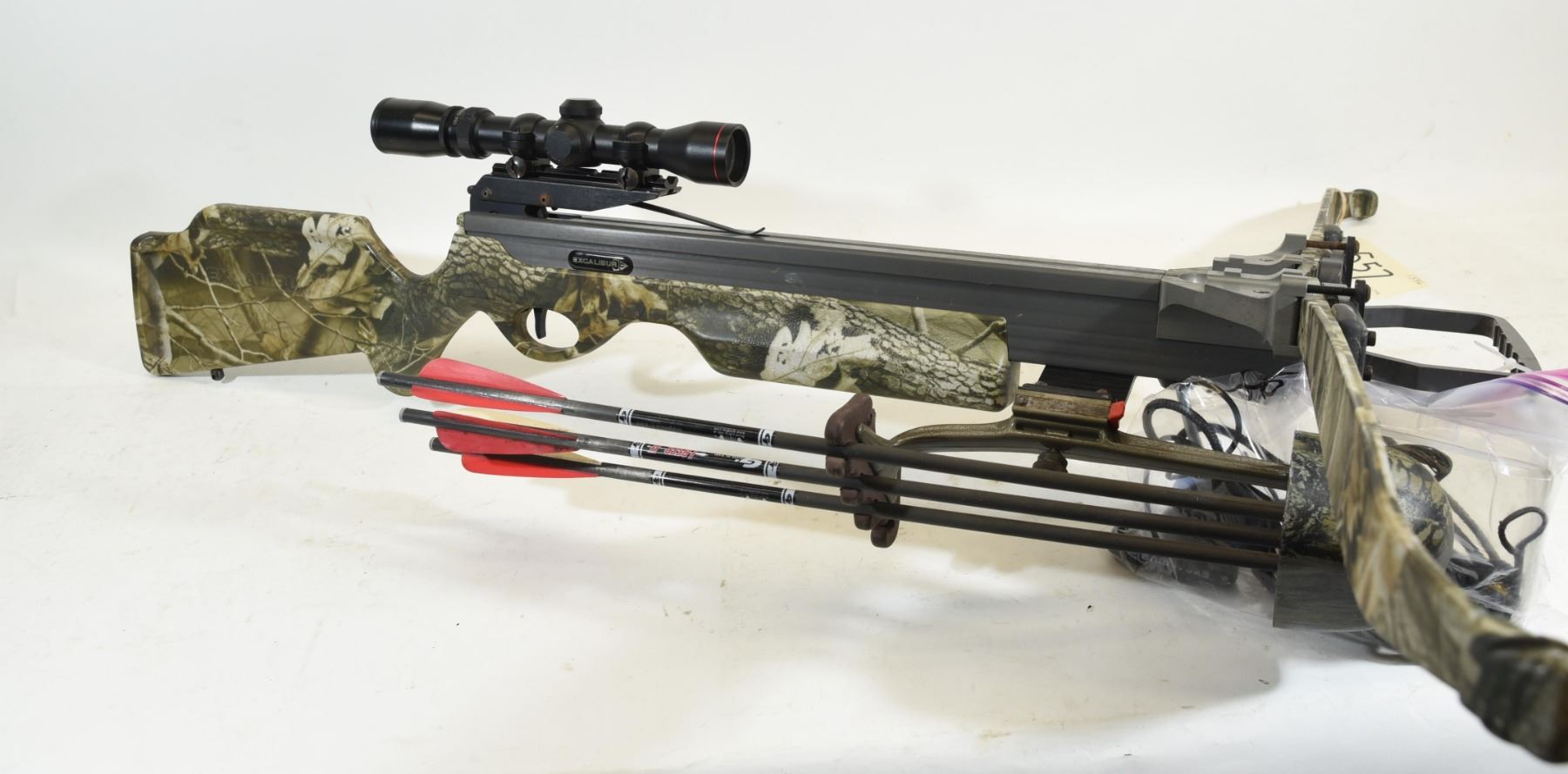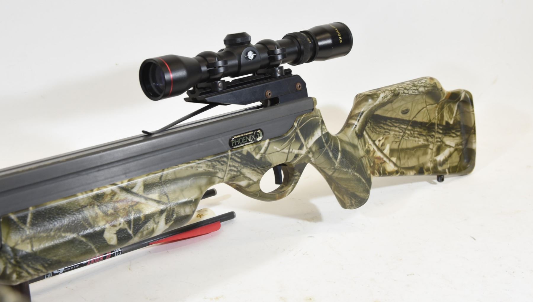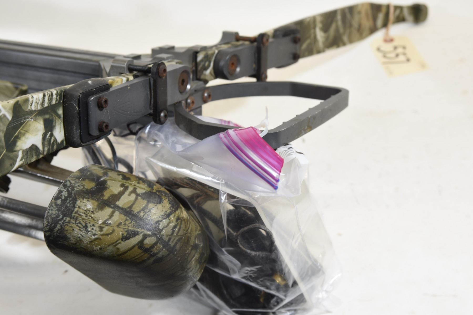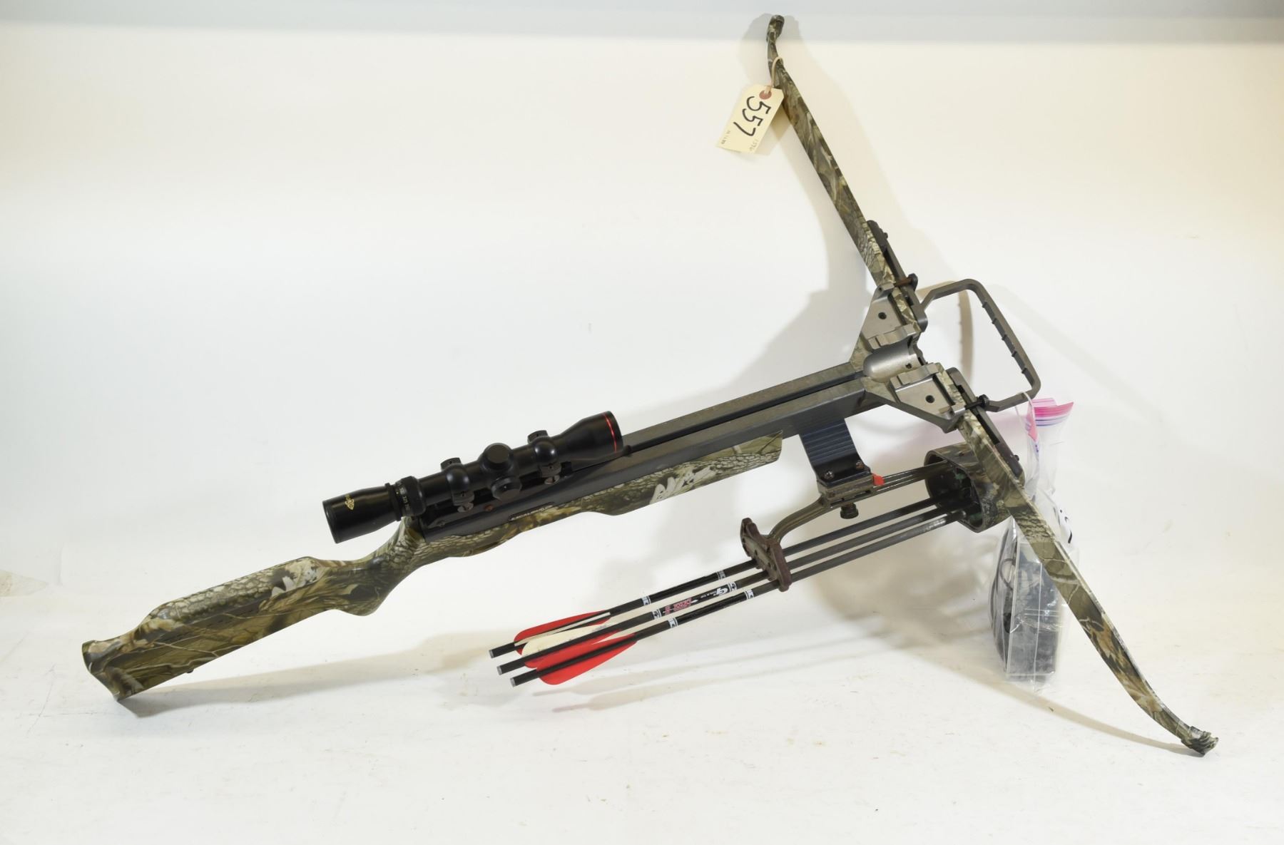 Real tree camo, scope, quiver with 3 bolts and broad heads, cocking aid and stringing aid
